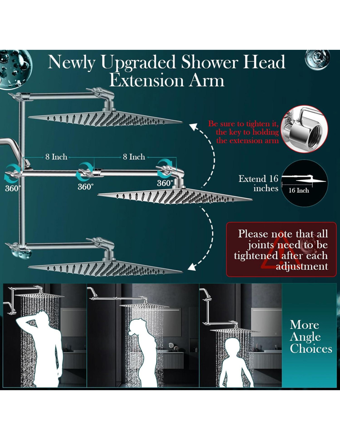 - Brazo de Extensión de Ducha Mejorado de 16 Pulgadas: El nuevo brazo de extensión de 16" evita la molestia de acercarse demasiado a la pared en la ducha. El enlace ajustado y los tornillos de ajuste mejoran enormemente la capacidad de carga del brazo de extensión. El ajuste dual ofrece una variedad de opciones de ángulo, hasta 15.47 pulgadas (39,24 cm) hacia arriba o hacia abajo, proporcionando una gran ducha vertical mientras se adapta a los requisitos de altura de una familia.