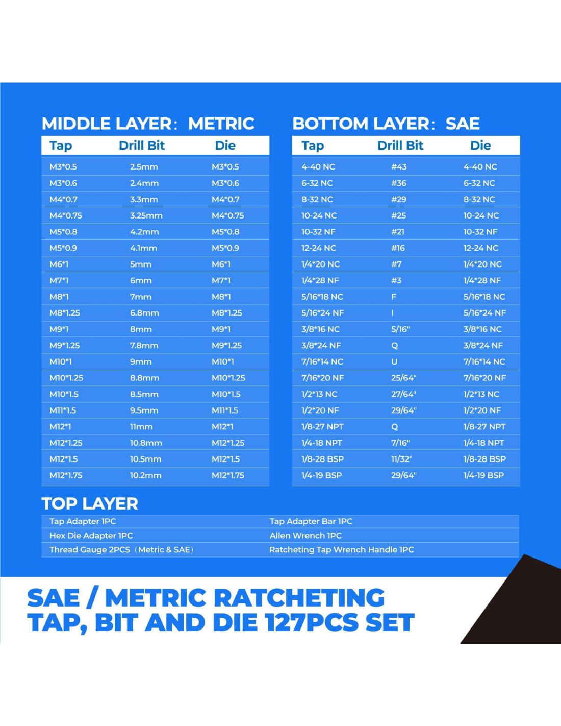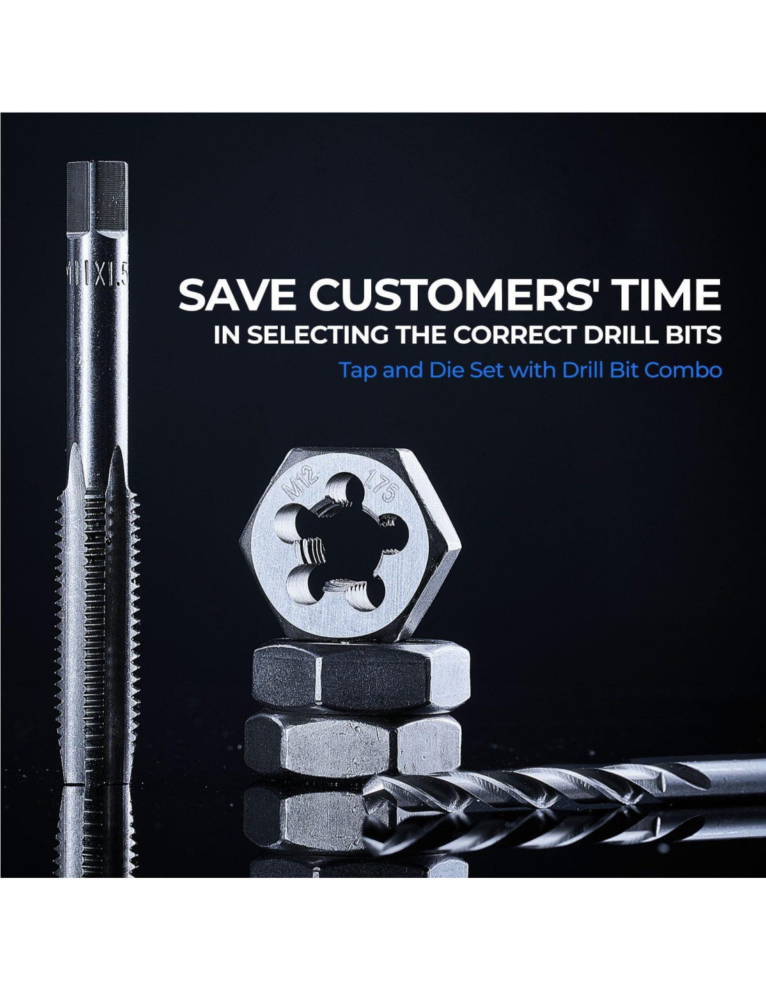 - AHORRANDO TIEMPO A LOS CLIENTES en seleccionar las brocas correctas - el juego de machos y matrices toolant sae métrico está equipado con brocas de tamaños correspondientes para diferentes machos, reduce el tiempo de aprendizaje de los clientes, no es necesario verificar repetidamente la tabla correspondiente, lo que evita problemas de producción debido a brocas faltantes o desajustadas, mejorando aún más la eficiencia de producción y reduciendo costos;