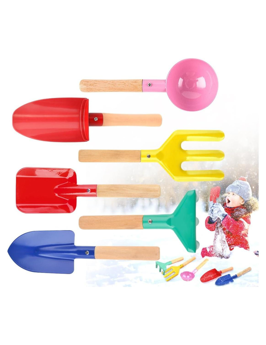 - [HERRAMIENTAS DE PALETA DE PLAYA] - Este conjunto de jardinería para niños incluye cuchara cilíndrica, pala, cuchara, tenedor, rastrillo y pala para niños. Esta longitud es de 8 pulgadas (20.32 cm) (varios colores). Cada herramienta está construida de metal de alta calidad, con un mango de madera duradera.