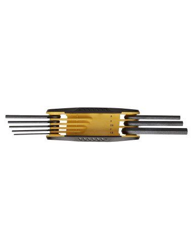 Juego de Llaves Allen Plegable STANLEY STHT71800 de 8 piezas: Esta unidad cuenta con una construcción compuesta duradera. Los insertos de goma en los laterales permiten un agarre seguro y el borde biselado ayuda a guiar la llave para una entrada suave y fácil de la llave hexagonal. Tiene marcas de tamaño impresas en el cuerpo de la llave hexagonal para una fácil identificación. Esta es una herramienta compacta y de autoalmacenamiento. Esta herramienta cumple con las especificaciones ANSI.