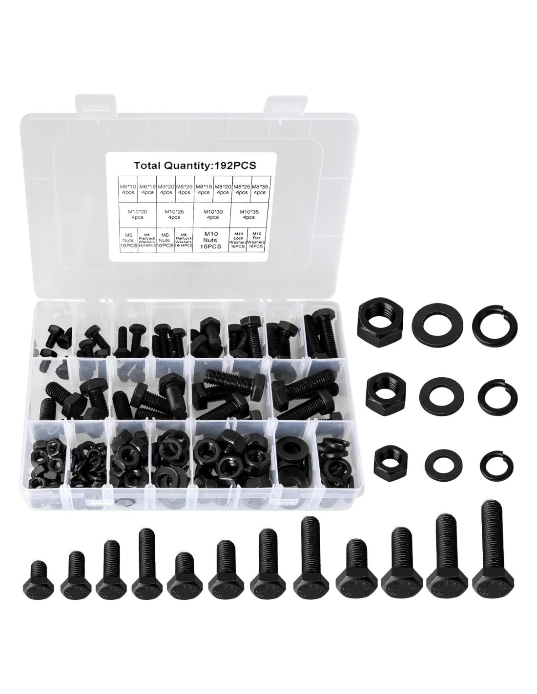 - [Kit de Surtido de 192PCS de Tuercas y Tornillos, Cortos de 10mm a largos de 35mm, Varios Tamaños para Satisfacer Más Necesidades] : El kit de surtido de tornillos métricos incluye 12 tamaños más comunes M6: 10mm, 16mm, 20mm, 25mm, Cada longitud de tornillos x 4; Tuercas M6 x 16; Arandelas M6 x 16. M8: 16mm, 20mm, 25mm, 35mm, Cada longitud de tornillos x 4; Tuercas M8 x 16; Arandelas M8 x 16. M10: 20mm, 25mm, 30mm, 35mm, Cada longitud de tornillos x 4; Tuercas M10 x 16; Arandelas M10 x 16, total 192 piezas. Varios surtidos de tuercas, tornillos y arandelas M6 M8 M10 pueden satisfacer los diferentes requisitos de los clientes.