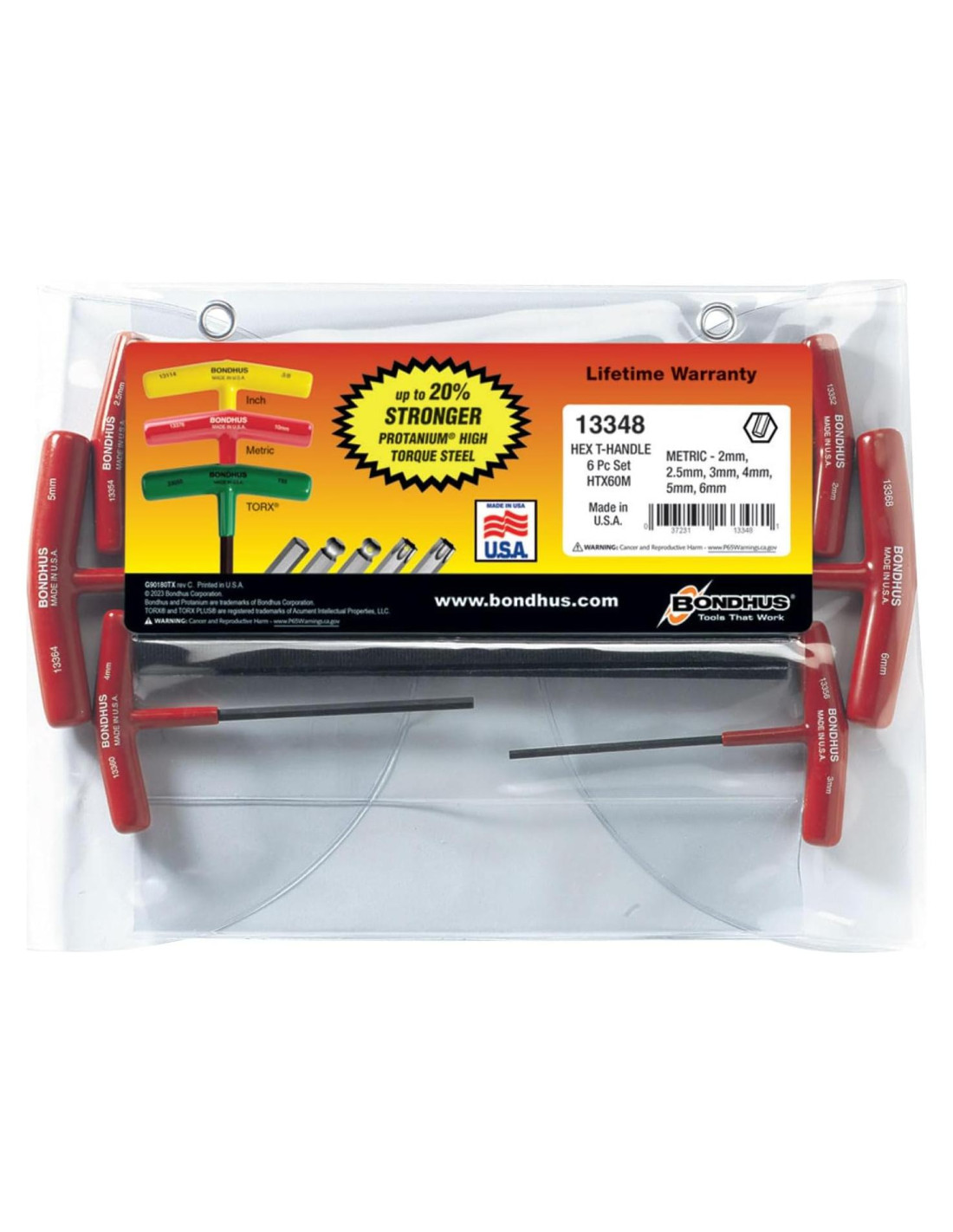 Descripción del Producto Bondhus 13348 Juego de 6 Mangos en T Hexagonales, tamaños 2-6mm Del Fabricante Los mangos en T hexagonales cuentan con mangos de acero soldados con empuñaduras acolchadas diseñadas para un máximo par de torsión mientras protegen la punta hexagonal y el tornillo de redondearse o desgastarse. El mango con empuñadura acolchada tiene forma ergonómica eliminando puntos de presión. El mango de alta resistencia genera un efecto de volante para una rápida inserción y extracción de tornillos. Solo disponible de Bondhus, el acero Protanium significa que estas son las herramientas más fuertes disponibles.