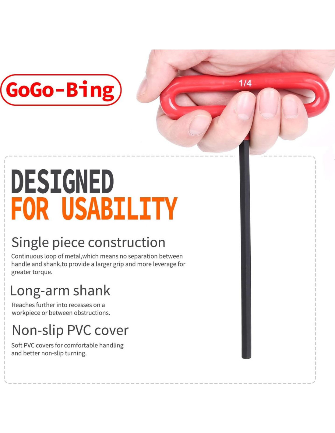 Gogo - Bing T - Mango T - Llave allen - Fabricante profesional de Llave Hex. Por qué elegir GogoBing - Fabricante profesional con características de excelente calidad presenta una construcción de mango de bucle de una sola pieza para mayor resistencia. Disponible en un soporte o con una bolsa para varias opciones de preferencia. Los juegos de soporte se pueden fijar a una pared o a un banco. Los juegos de bolsa se ajustan de manera compacta en una caja de herramientas o cuelgan en el taller. Los juegos en pulgadas y métricos están disponibles en longitudes de 6 pulgadas (15.24 cm). Los Juegos de Agarre Cushion proporcionan mayor comodidad. Los Juegos de Agarre Estándar ofrecen una opción más económica. Contiene tamaños en pulgadas: 3/32, 7/64, 1/8, 9/64, 5/32, 3/16, 7/32, 1/4 & tamaños métricos: 2.5, 3, 3.5, 4, 4.5, 5, 5.5, 6 & tamaño Torx: T9, T10, T15, T20, T25, T27, T30, T40. Las llaves hexagonales GGB (llaves allen) se utilizan para accionar sujetadores de socket hexagonal interno (cabeza allen). Llaves que tienen ejes más largos para proporcionar mayor alcance y palanca, se apilan bien y están organizadas en una bolsa para un almacenamiento compacto, incluso en su caja de herramientas.