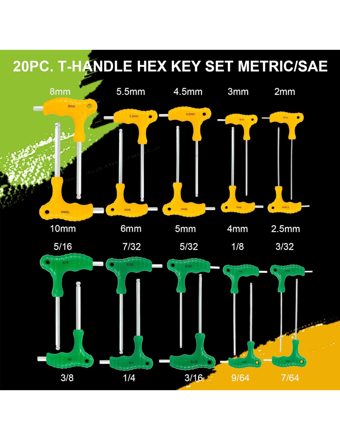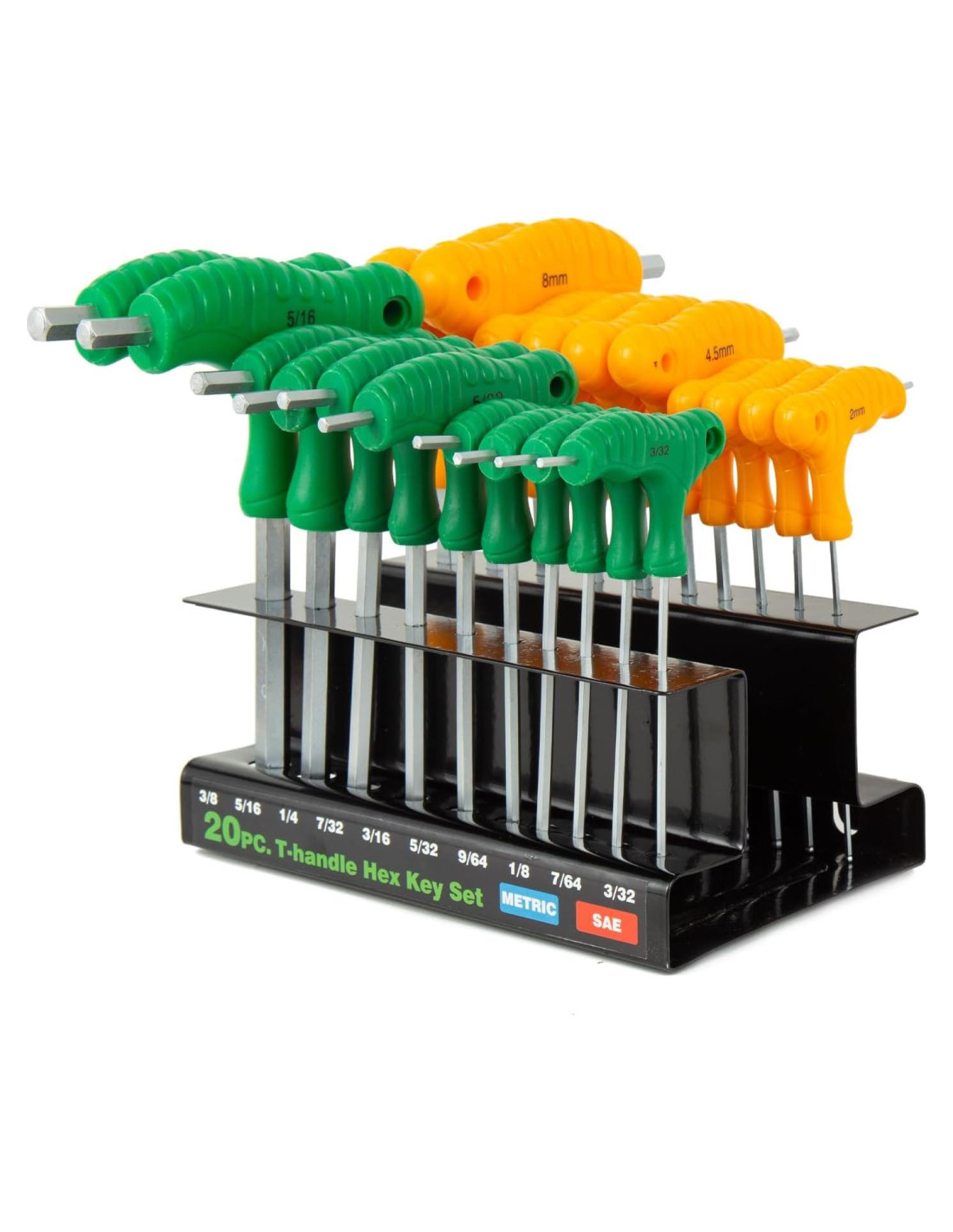 - [JUEGO DE 20 PIEZAS] Incluye tamaños tanto métricos como imperiales (de 2mm a 10mm, de 3/32" a 3/8") de llaves hexagonales de dos colores.