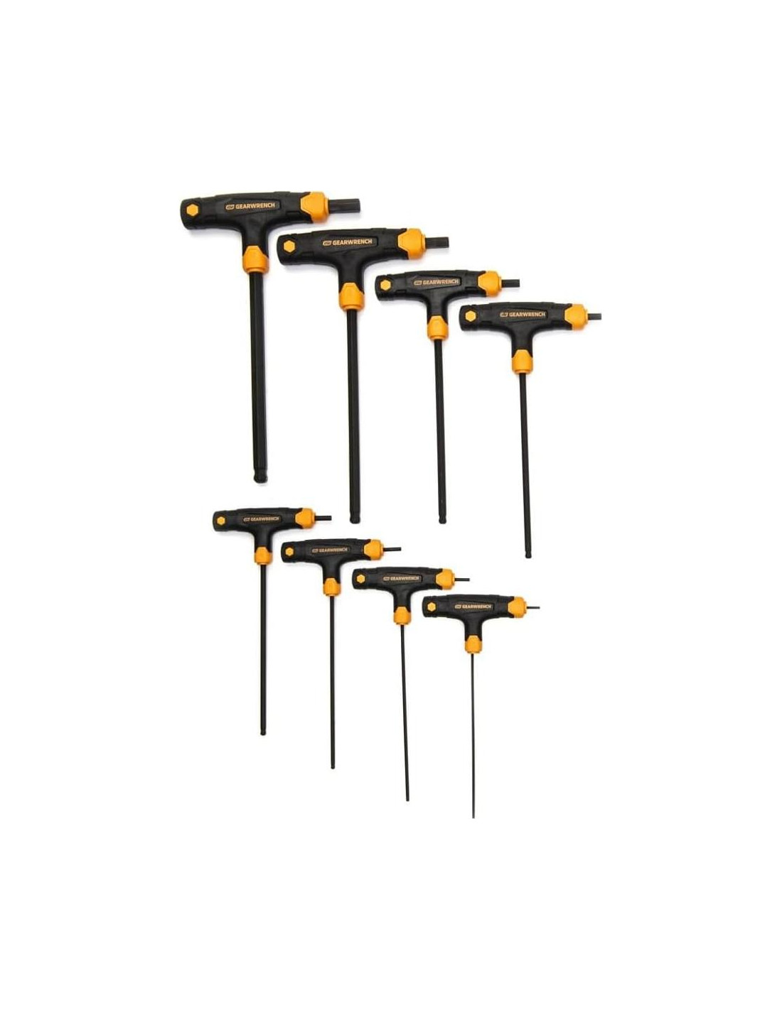 El juego de llaves hexagonales en forma de T de 8 piezas métricas de GEARWRENCH incluye llaves hexagonales fabricadas en acero aleado para ofrecer la máxima resistencia y resistir la distorsión rotacional. El diseño de bola proporciona un acceso aumentado a 25 grados, y los mangos en T ofrecen un agarre cómodo para un uso antideslizante y mayor torque.