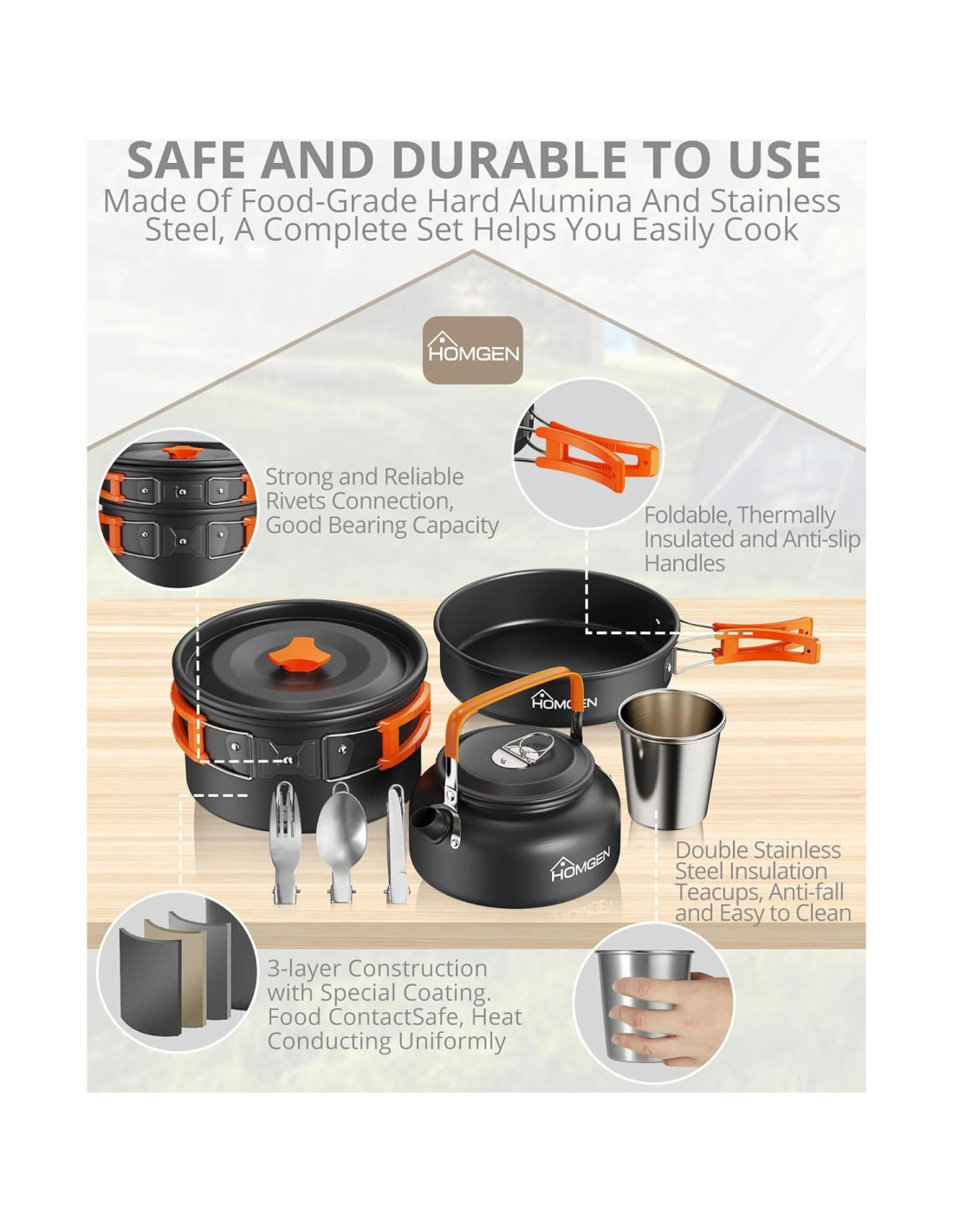 - *Nuestros Utensilios de Cocina para Camping HOMGEN están Hechos de Aluminio Duro Avanzado. Resistente al Desgaste y No Fácilmente Dañado. La Taza de Té está Construida con Doble Aislamiento de Acero Inoxidable. Y la Olla y la Sartén tienen Mango Resistente al Calor y Antideslizante para Proteger tus Dedos de Altas Temperaturas.