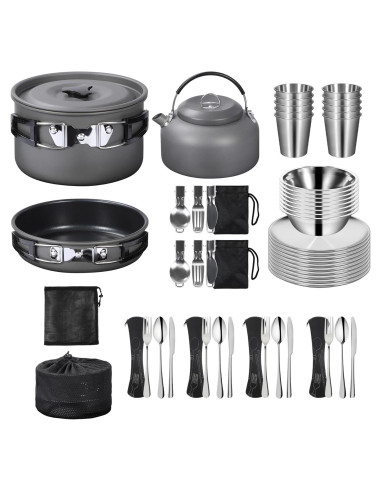 - Versátil para Cualquier Aventura al Aire Libre: Ya sea que estés preparando café por la mañana en la tetera, friendo huevos en la sartén o sirviendo guiso en los platos, este set se adapta a todas las necesidades de cocina. Los materiales duraderos y el diseño pensado lo convierten en un compañero confiable para viajes de camping en familia, caminatas en solitario o parrilladas en el patio trasero. Eleva tus comidas al aire libre con conveniencia y funcionalidad.