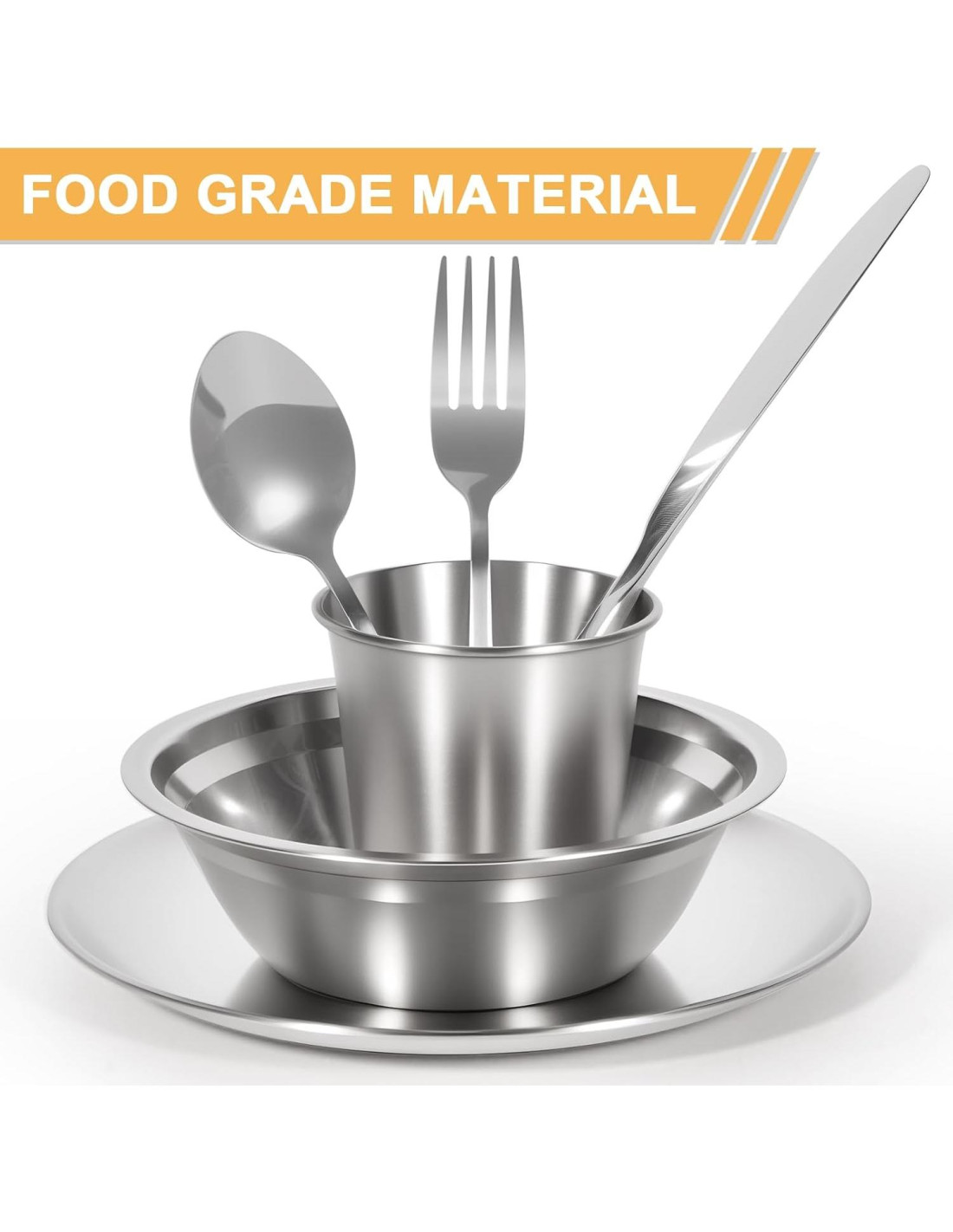- Set Completo para 4 Personas: Este juego de utensilios de camping incluye todo lo que necesitas para 4 personas. Hay 6 platos, 4 cuencos, 6 tazas de 300ml, 4 cucharas, 4 tenedores, 4 cuchillos, 4 estuches de cubiertos y 2 bolsas de malla. Es una gran opción para cenas familiares o pequeñas reuniones.