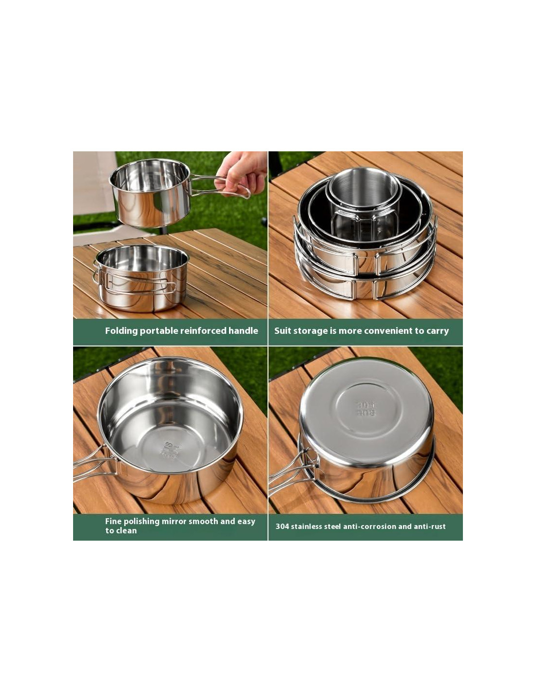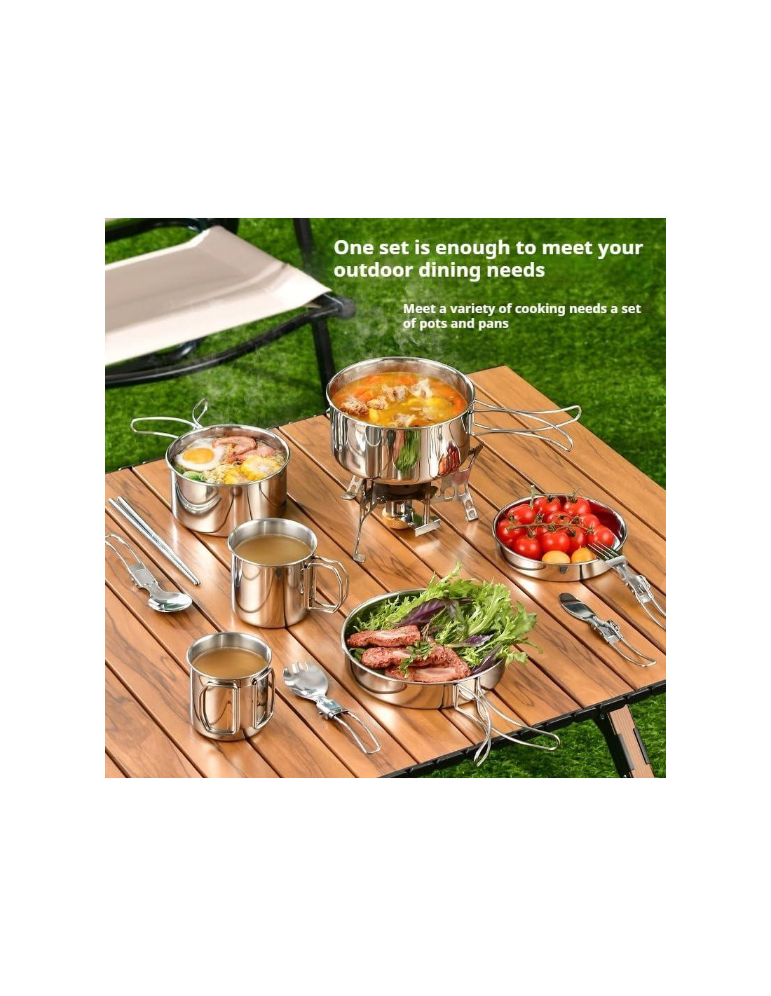 Este utensilio de cocina al aire libre está hecho de acero inoxidable profesional 304. El set incluye 2 ollas/tazones pequeños, una sartén pequeña, 2 tazas, tenedores, cucharas, para una cocción y limpieza sin esfuerzo. Diseñado para acampar, hacer senderismo y aventuras al aire libre, este set compacto y portátil viene con una elegante bolsa de transporte para facilitar el transporte. Ya sea que estés preparando una comida sustanciosa sobre la fogata o preparando un bocadillo rápido en el sendero, este versátil set de utensilios de cocina te tiene cubierto. Mejora tu experiencia culinaria al aire libre con este duradero y práctico compañero de cocina.