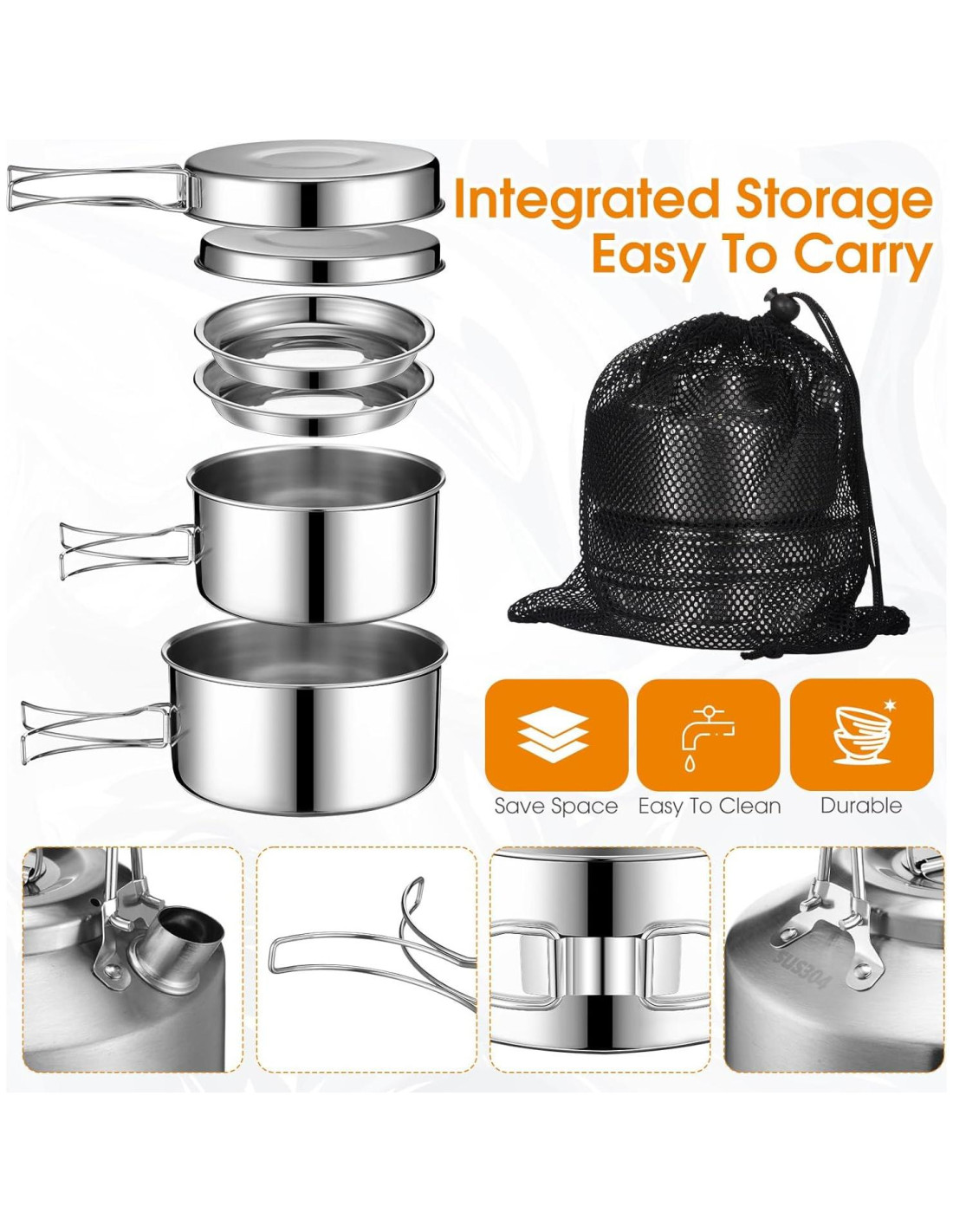 - Duradero y Fácil de Limpiar: hecho de materiales de alta calidad, no tóxicos, este set de utensilios de cocina para camping es seguro de usar; El set de platos está fabricado de acero inoxidable 410, mientras que la tetera y los utensilios están hechos de acero inoxidable 304; Son resistentes tanto a altas temperaturas como a condiciones de congelación, haciéndolos fuertes, fáciles de limpiar y duraderos