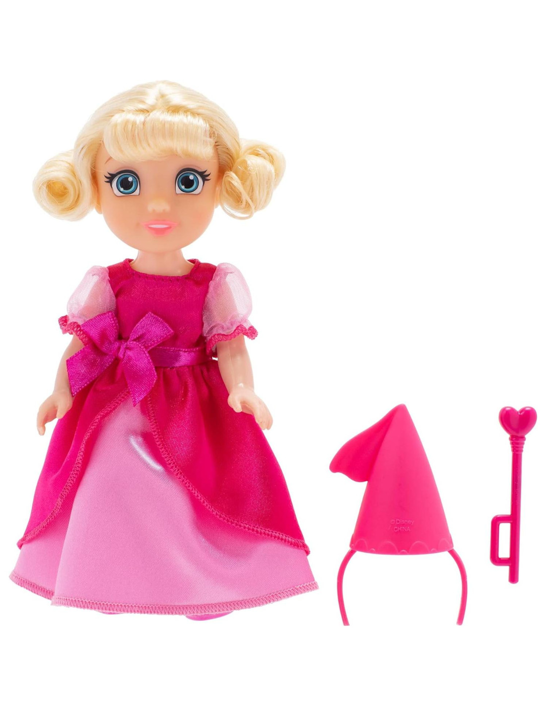 - Charlotte está vestida con su vestido rosa de moda completo, varita y corona