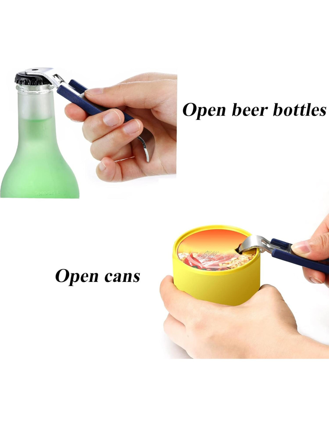 - Diseño de Doble Cabeza: un lado es un abrebotellas, el otro es un abre latas