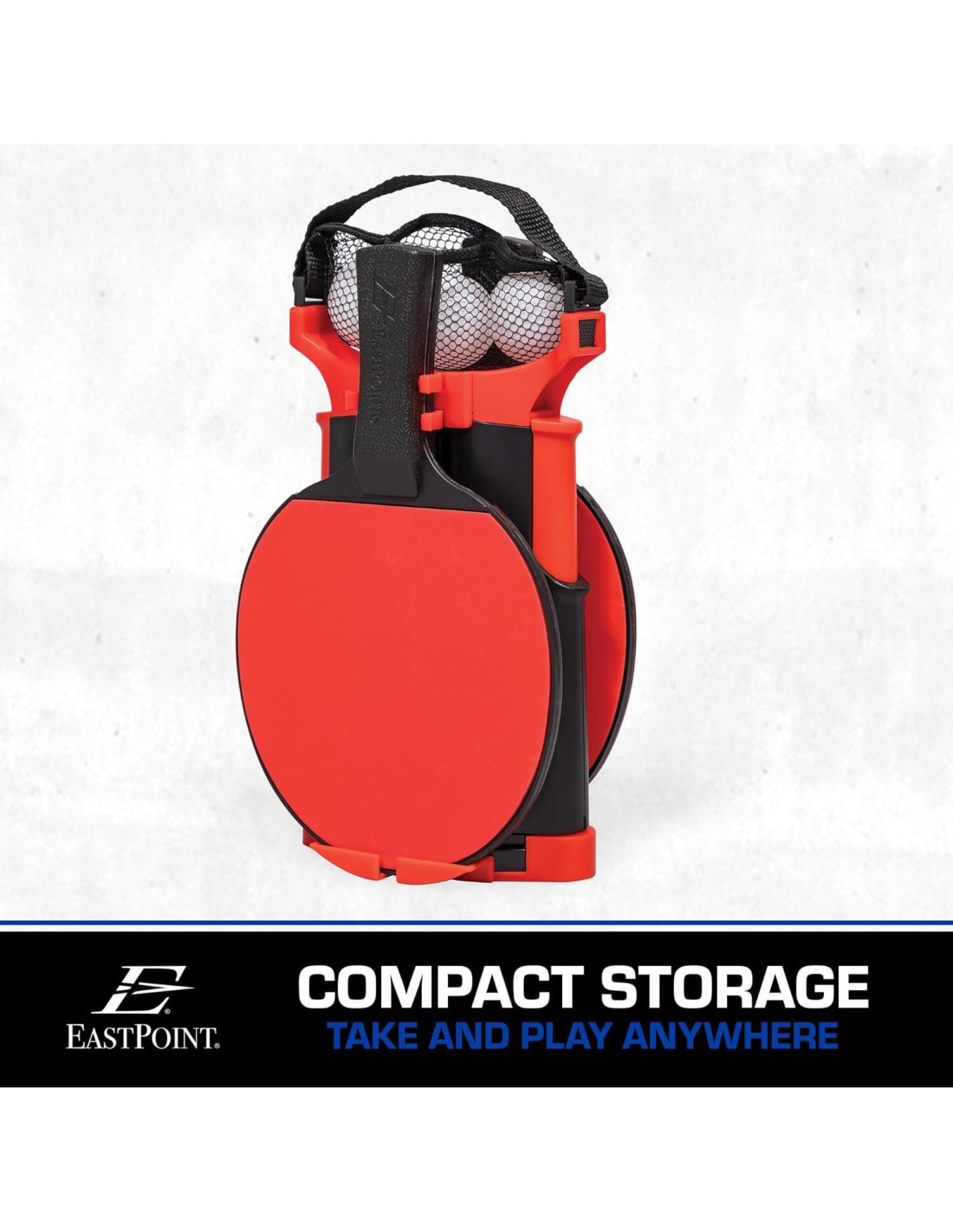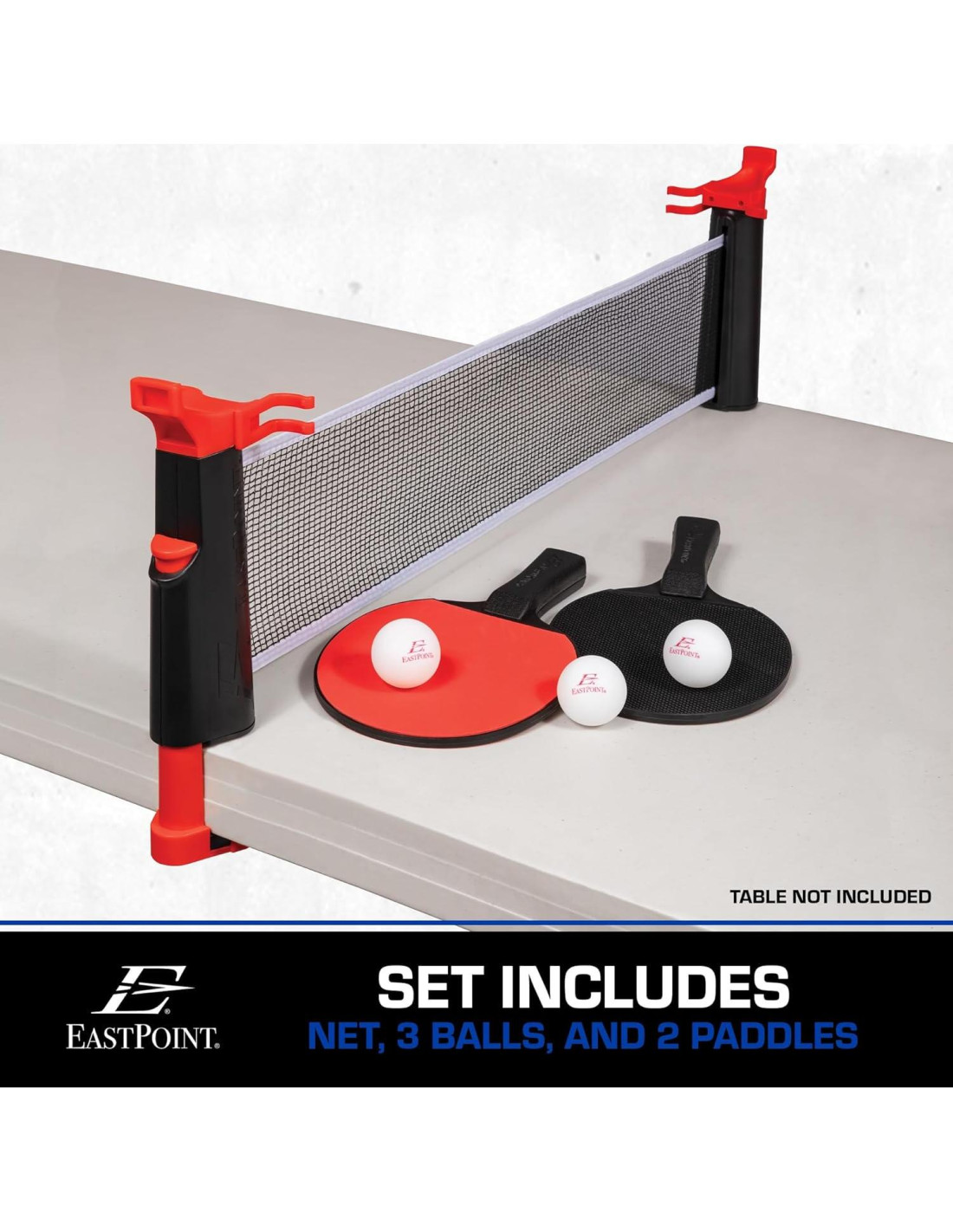 Juega al tenis de mesa en cualquier momento en casi cualquier mesa con el conjunto de red y postes de tenis de mesa EastPoint Sports Everywhere. El conjunto de red y postes de tenis de mesa Everywhere es fácilmente ajustable para adaptarse a cualquier mesa de hasta 60 pulgadas (152,4 cm) de ancho y se puede configurar en minutos. ¡Convierte tu comedor, cocina u oficina en una arena de tenis de mesa emergente! Simplemente ajusta los postes para que se adapten a la mesa de forma segura y retrae la red a la longitud deseada para proporcionar el nivel adecuado de tensión durante el juego. El conjunto de red y postes de tenis de mesa Everywhere incluye 2 palas de madera y 3 pelotas de tenis de mesa, así como almacenamiento incorporado. El conjunto de red y postes de tenis de mesa Everywhere se empaca fácilmente para que puedas llevar la diversión a donde vayas.