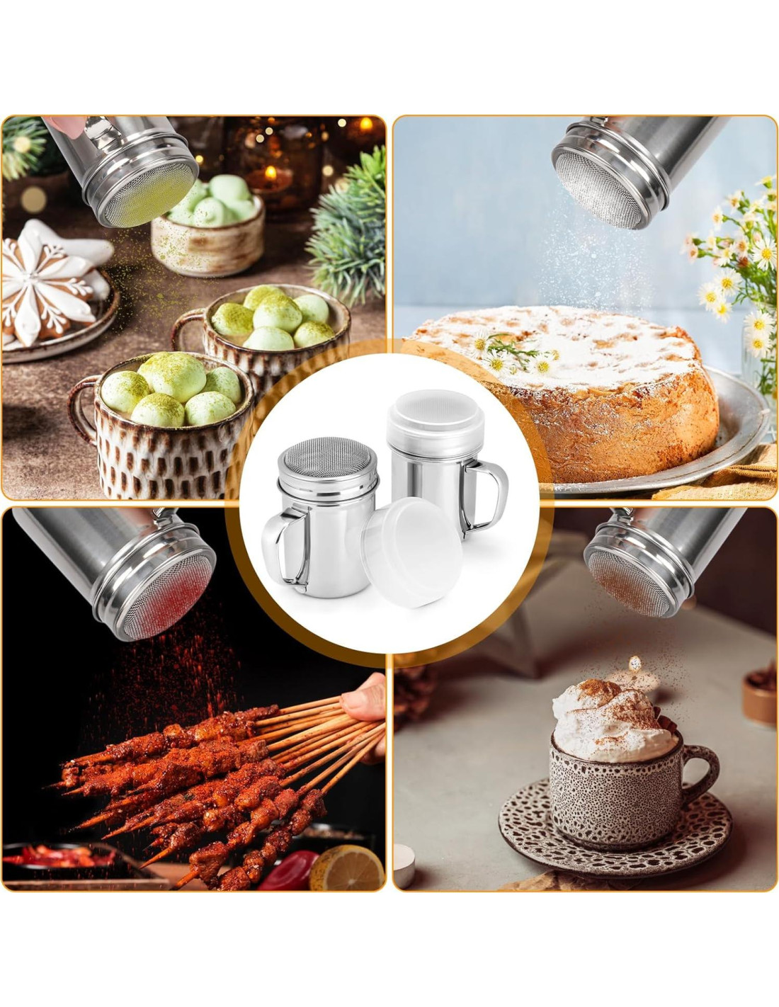 - Este tamiz de malla fina diseñado con tapas de giro, conveniente para agregar polvo u otras especias. Los tamices ideales para azúcar en polvo, canela, bicarbonato de sodio, cacao, maicena, café, harina o cualquier otra especia, condimentos.