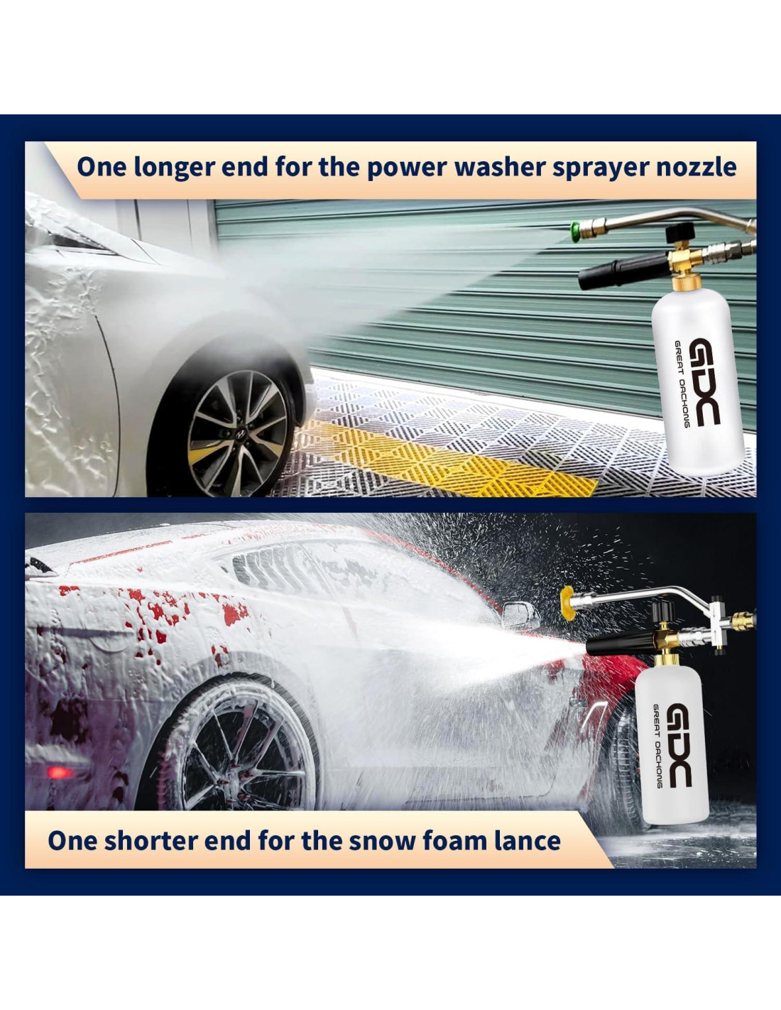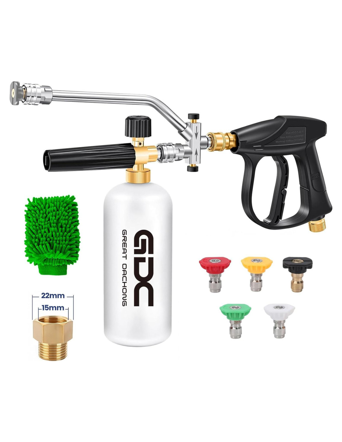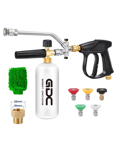 - Kit Completo de Pistola de Espuma para Lavado de Autos - Su kit completo de pistola de espuma para lavado de autos incluye: rociador de jabón de cannon de espuma, una pistola de lavadora a presión, accesorio de doble lanza y 5 boquillas intercambiables con diferentes ángulos (0, 15, 25, 40, 65). Este Kit de Pistola de Espuma para Lavadora a Presión está listo para ofrecer una limpieza completa y eficiente, directamente de la caja.