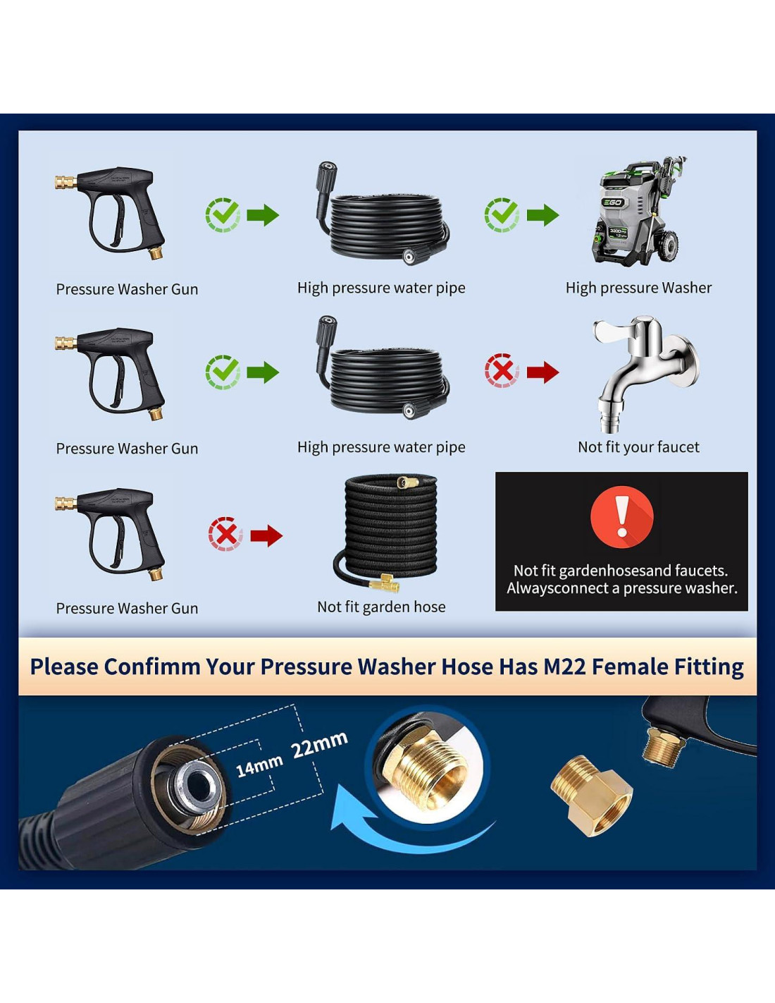 - Compatibilidad Universal con Lavadoras a Presión - Esta pistola de lavadora a presión universal es compatible con accesorios M22-14mm y M22-15mm, y cuenta con un conector rápido de 1/4" para la mayoría de las configuraciones de pistolas de lavadoras a presión eléctricas o de gas. No es adecuada para mangueras de jardín o grifos regulares; este es un accesorio de limpieza de alta presión dedicado.