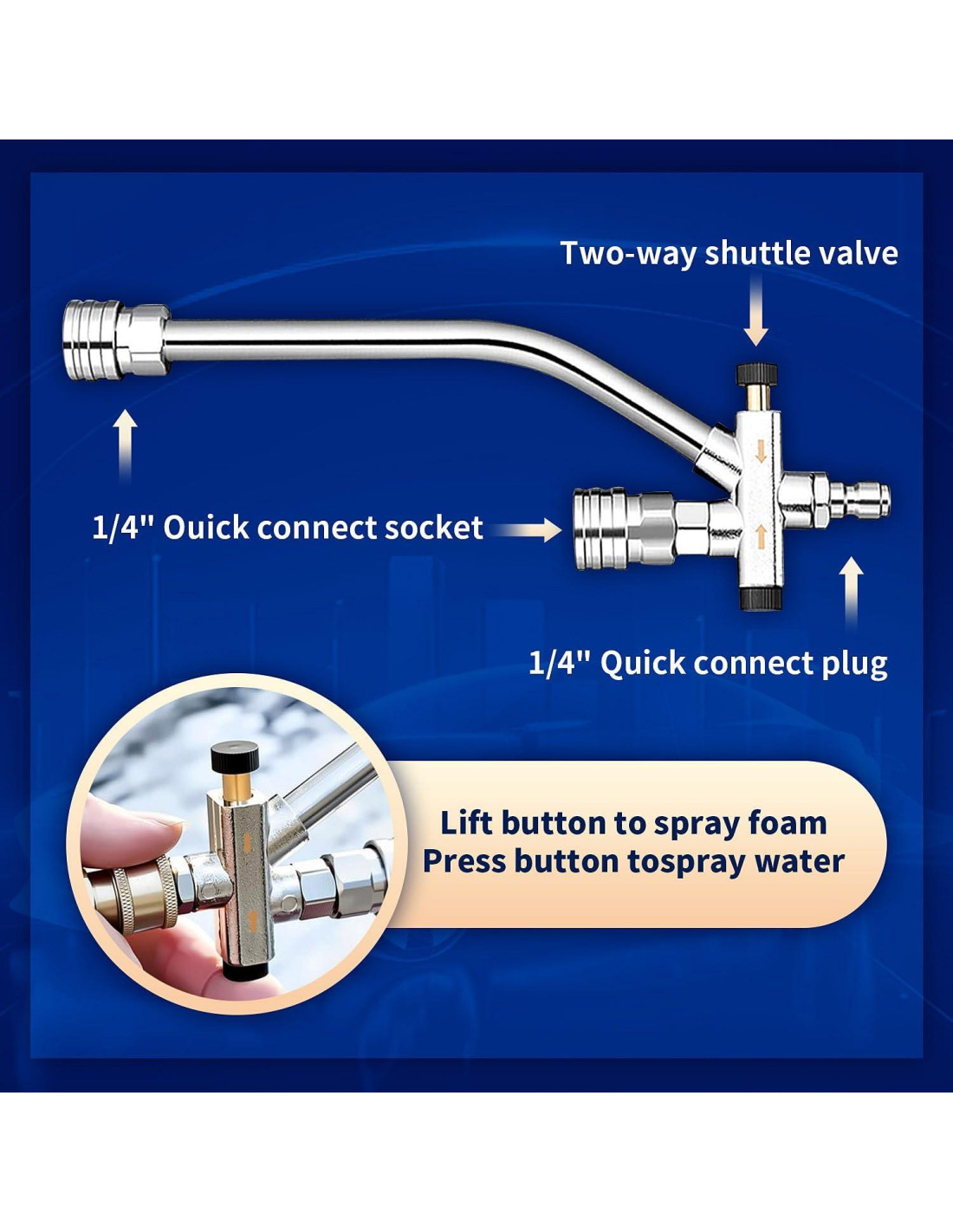 - Sistema de Conexión Doble 2-en-1 - Esta pistola de espuma de limpieza de alta presión cuenta con una innovadora varita de lavadora a presión de doble lanza con una válvula de desplazamiento incorporada, que permite cambiar sin problemas entre los modos de rociado de espuma y agua. No es necesario desmontar o cambiar herramientas, solo gire la válvula y limpie con mayor rapidez y eficiencia.