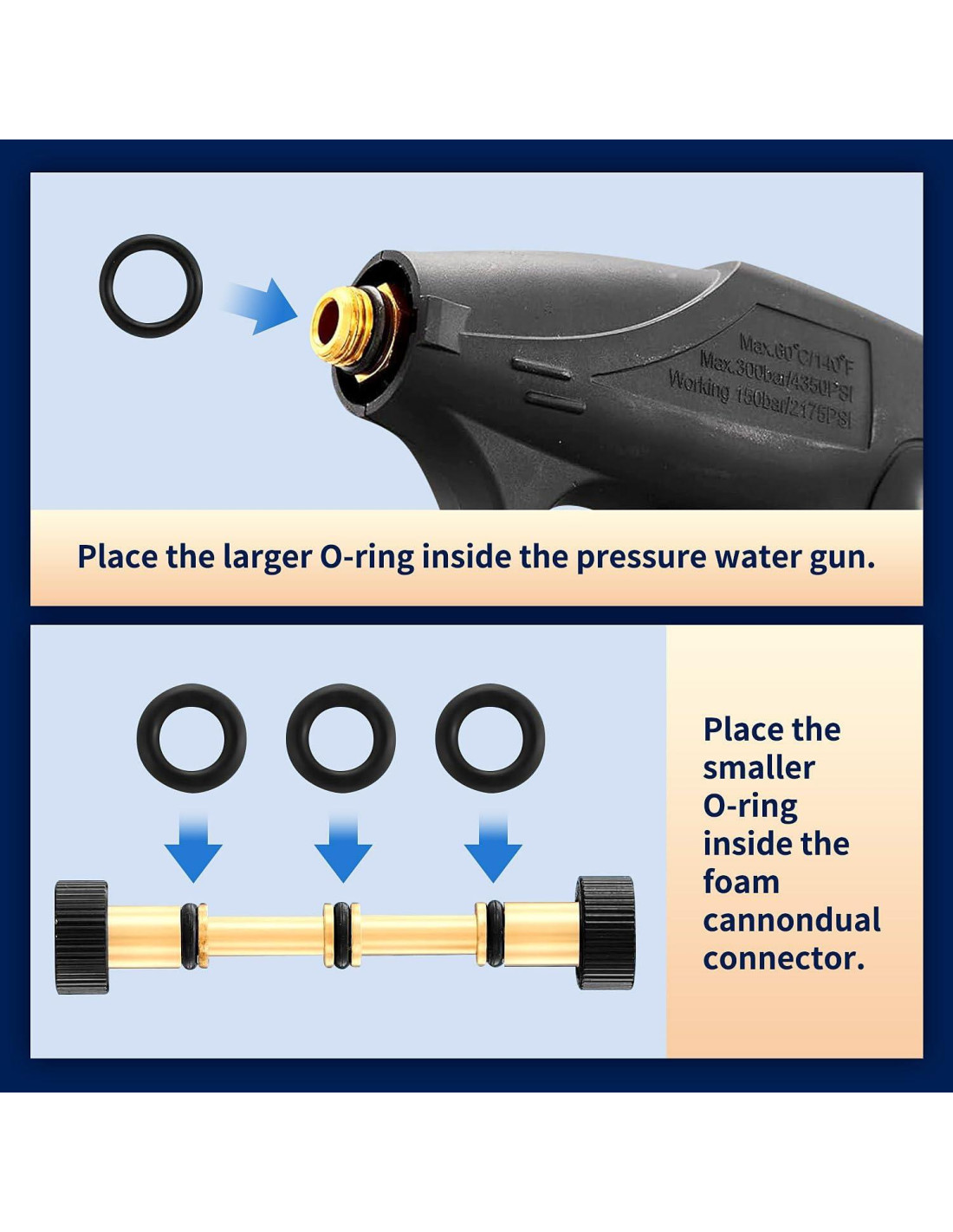 - Recordatorio y Consejos - Esta pistola de lavadora a presión es compatible solo con sistemas de lavadoras a presión, no con mangueras de jardín o grifos. Diseñada para conectores M22-14mm, con un adaptador para M22-15mm. Asegúrese de que la tuerca de bloqueo negra en el conector doble de la cannon de espuma esté segura para evitar fugas. El kit incluye juntas tóricas adicionales; reemplácelas rápidamente si ocurre una fuga. Presión de trabajo máxima: 4000 PSI. Superar esto puede dañar el producto.