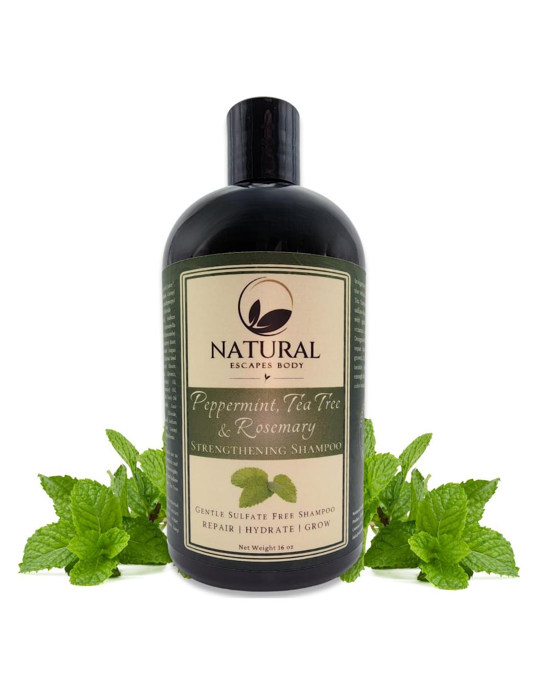 - Aceite de menta, árbol de té y romero para el crecimiento del cabello: Este champú para la pérdida de cabello promueve el crecimiento y grosor del cabello al estimular el flujo sanguíneo al cuero cabelludo. Fortalece el cabello al aumentar el suministro de oxígeno y nutrientes a los folículos y raíces del cabello, lo cual es esencial para un crecimiento robusto del cabello. El cabello crecerá a su máximo potencial, resultando en un cabello más largo, más grueso y más lleno.
