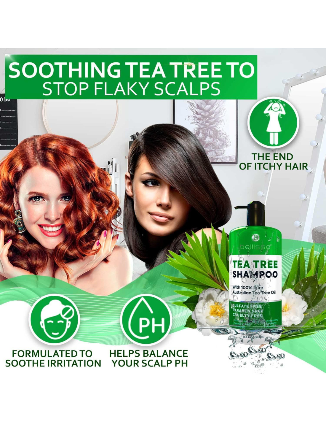 - TODOS LOS TIPOS DE CABELLO: Considerado como uno de los mejores champús para cabello graso, la fórmula de aceite de árbol de té de Bellisso es tan versátil como tú; Este champú libre de parabenos es seguro de usar con cabello decolorado así como con cabello tratado con color; Además, nuestro champú de árbol de té para hombres y mujeres combate los flocos y la picazón para personas con cabello lacio, rizado, ondulado e incluso encrespado