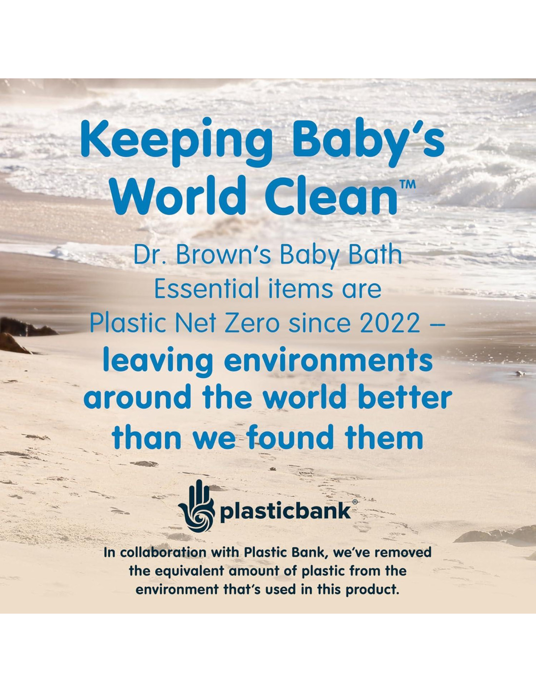 - Plástico Cero Neto. Los artículos Esenciales para Baño de Bebé de Dr. Brown son Plástico Cero Neto desde 2022. En colaboración con Plastic Bank, hemos eliminado la cantidad equivalente de plástico del medio ambiente que se utiliza en este producto, dejando los entornos alrededor del mundo mejor de lo que los encontramos.