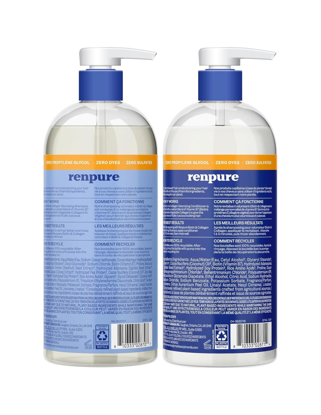 - El conjunto de champú y acondicionador Renpure Biotina y Colágeno a base de plantas está infundido con nutrientes para ayudar al cabello fino a lucir y sentirse más grueso y abundante.