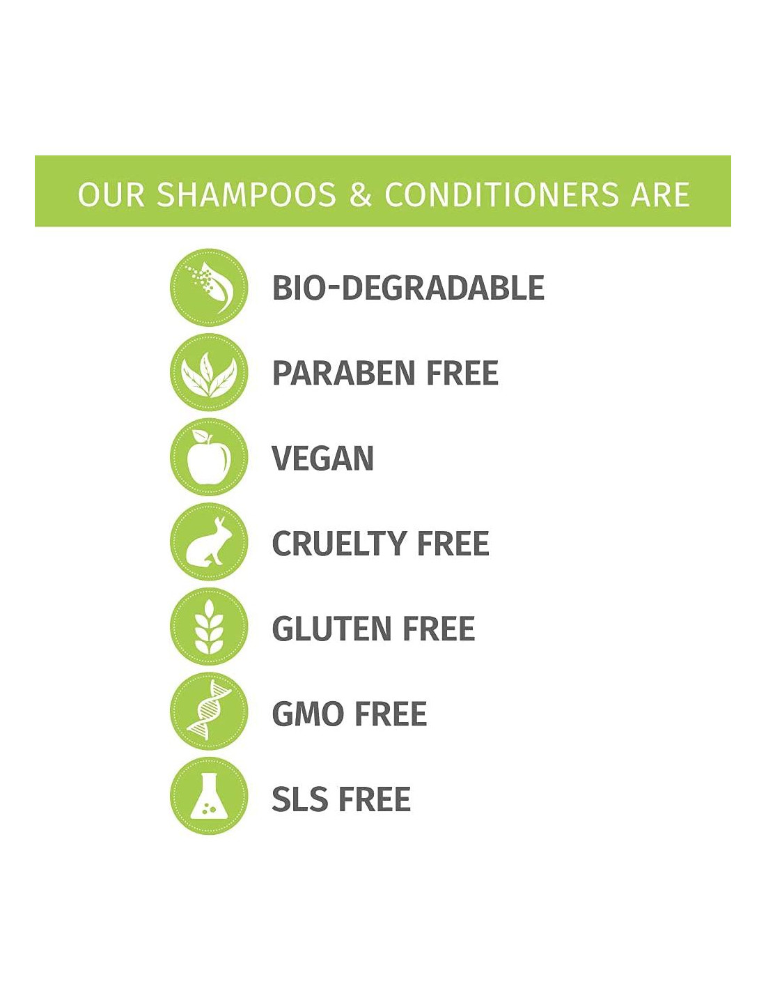 - SIN QUÍMICOS AGRESIVOS: Tanto el champú como el acondicionador son libres de SLS, libres de parabenos, libres de ftalatos, biodegradables, libres de crueldad, veganos, sin gluten y no contienen colorantes.