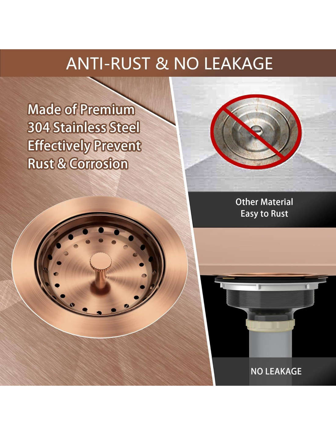 Este desagüe de fregadero de cocina de cobre está construido con acero inoxidable de grado premium 304, que es resistente a la oxidación y la corrosión. El kit de desagüe de fregadero de cocina es altamente duradero para un uso prolongado.