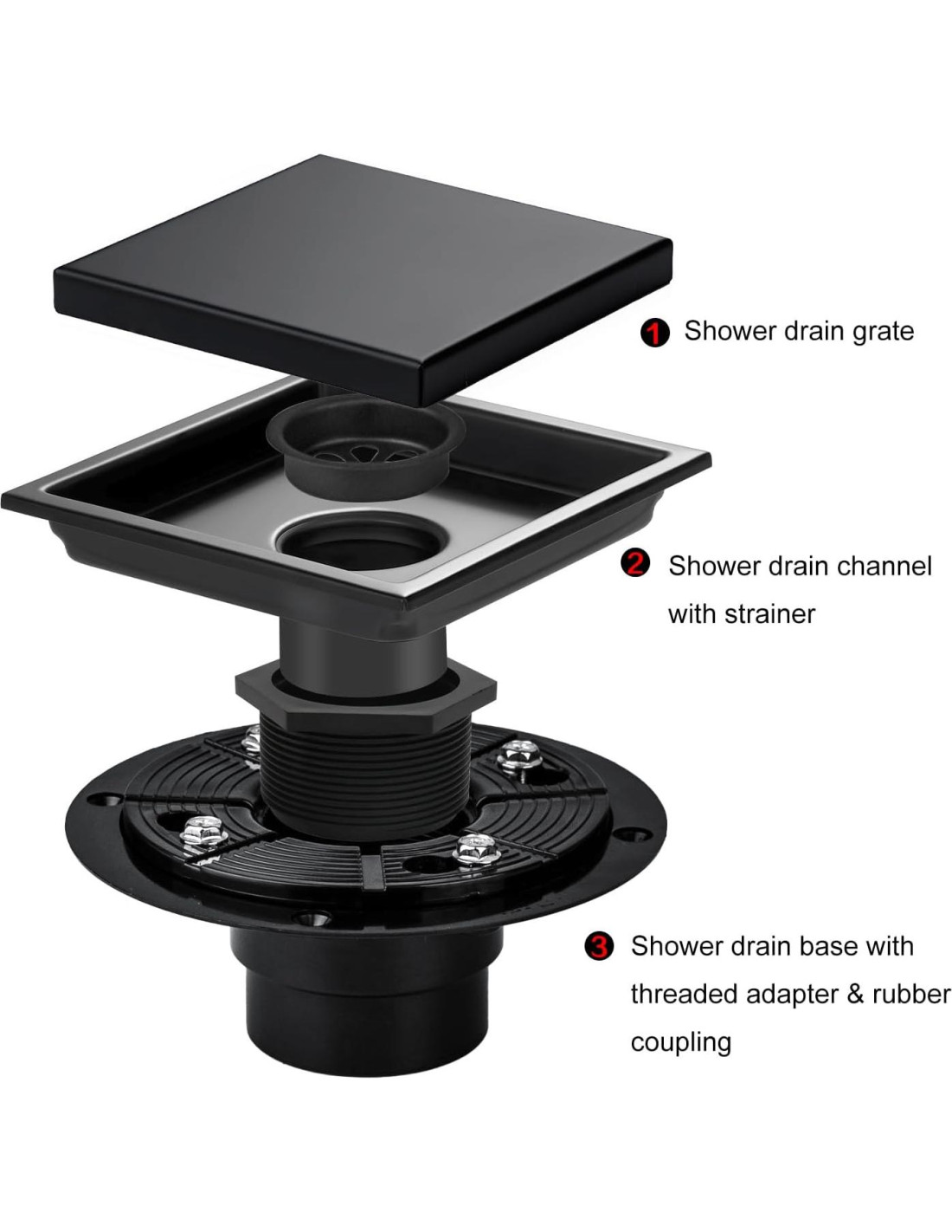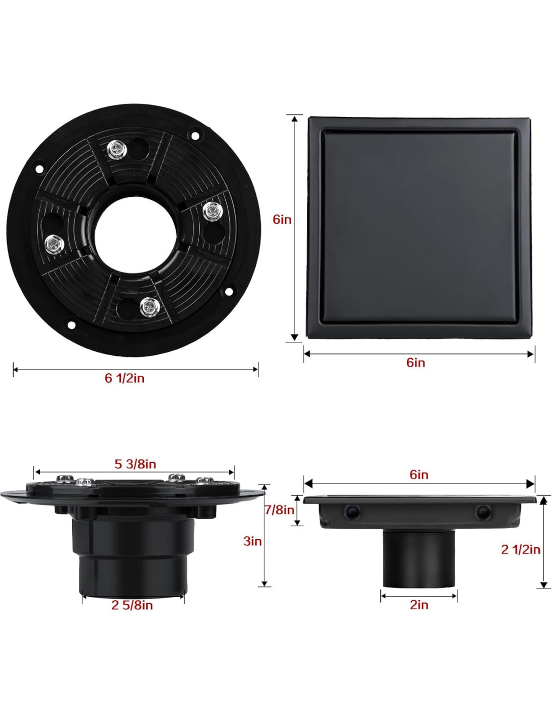- [Tamaño] El desagüe de ducha negro es de 6 x 6 pulgadas (15.24 x 15.24 cm), salida central de 2" (5.08 cm). Se puede lograr un desplazamiento promedio de 60 litros/min (sin malla filtrante). Puede eliminar la humedad residual de manera efectiva en el fondo.