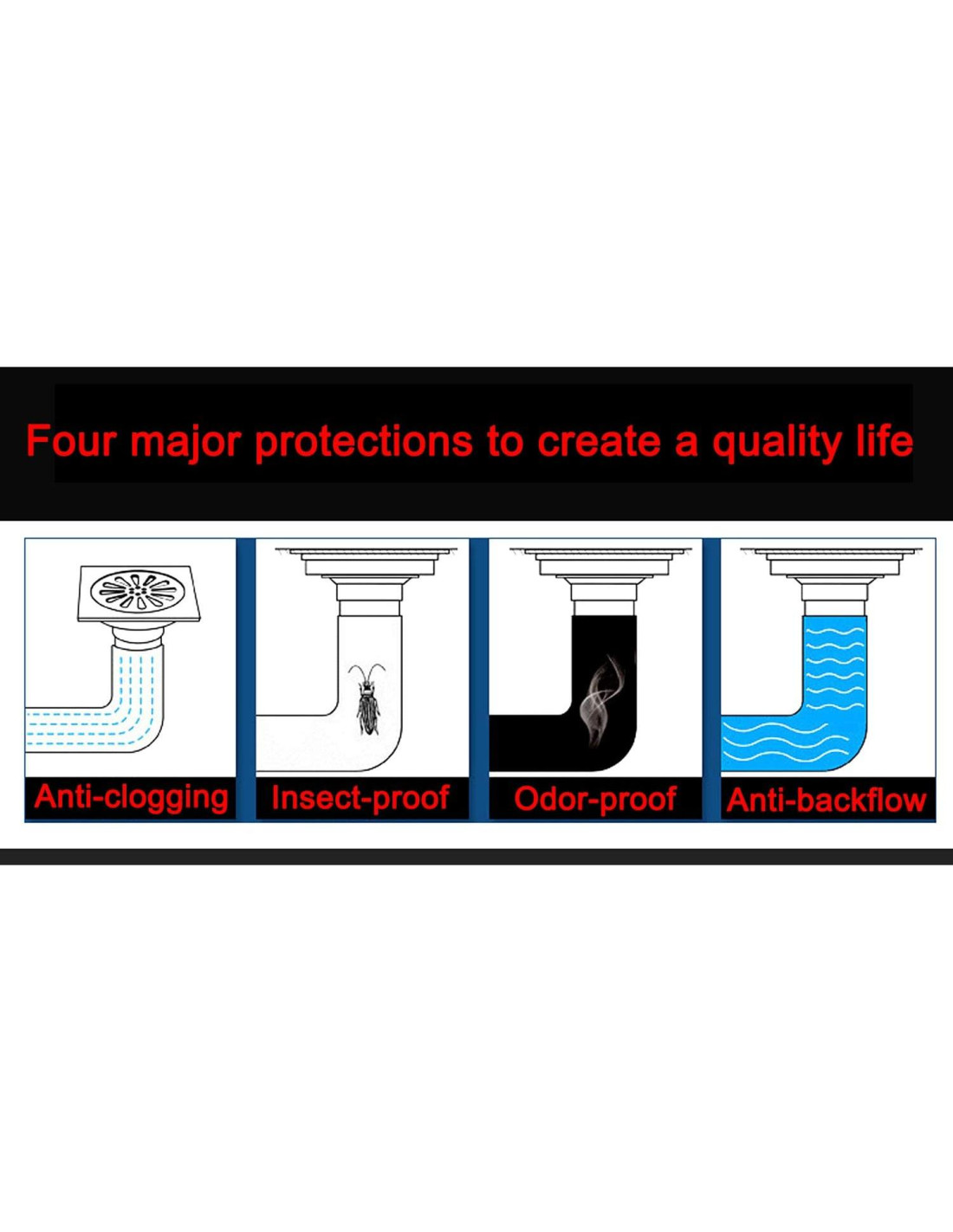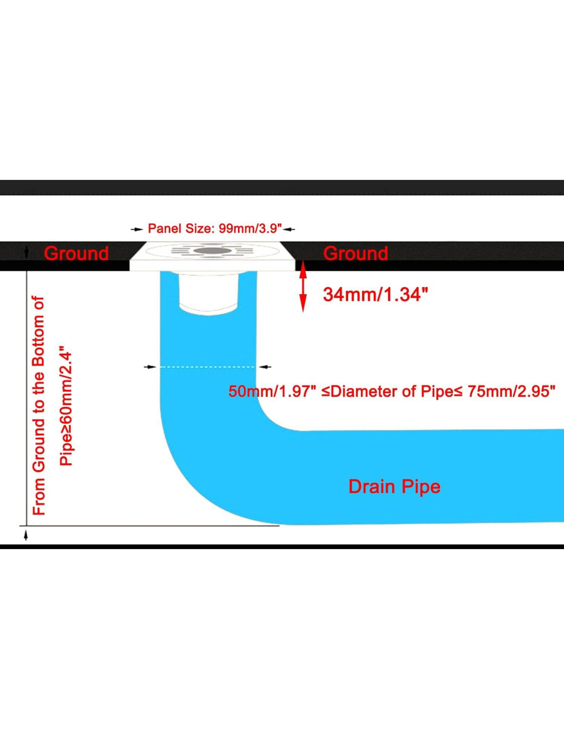 - Diseño cuadrado, ancho de 3.9 pulgadas (9.9 cm), salida de flujo alta de 1.34 pulgadas (3.4 cm), diámetro de salida de 1.54 pulgadas (3.9 cm), adecuado para tubería de desagüe de 50-75mm (1.97"-2.95").