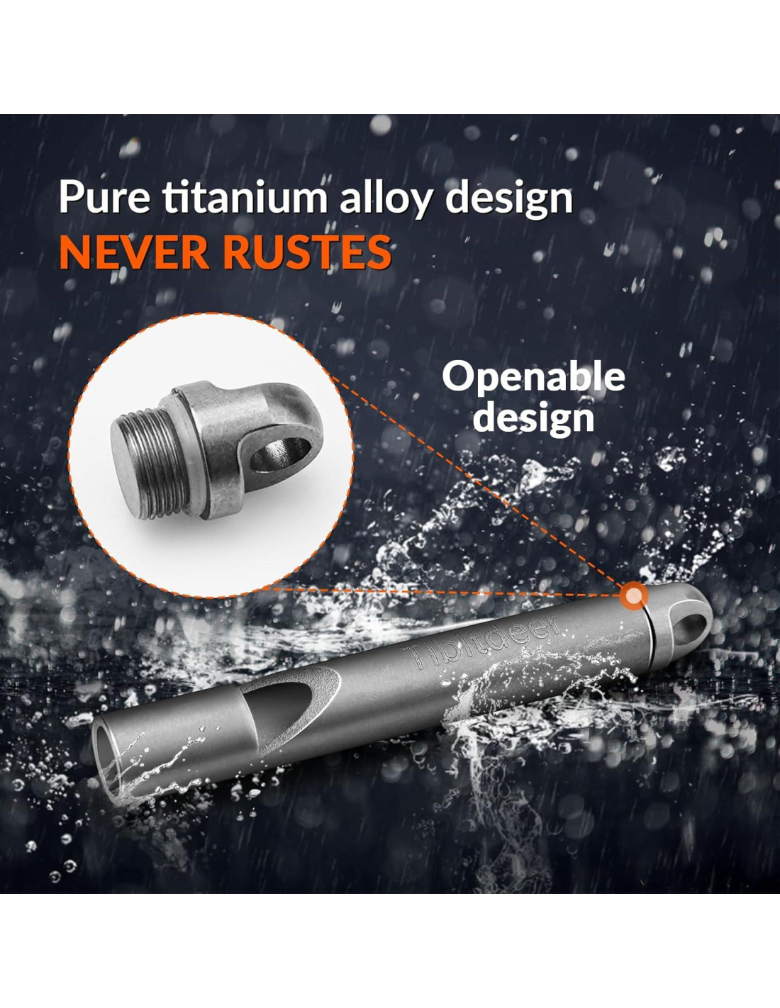 - CONSTRUCCIÓN DE TITANIO PREMIUM: Este silbato de un solo tubo está fabricado con titanio de alta calidad, lo que lo hace impermeable, resistente a la corrosión, no tóxico y no alérgico. Está diseñado para soportar entornos difíciles, asegurando durabilidad y fiabilidad a largo plazo para tus necesidades de seguridad.