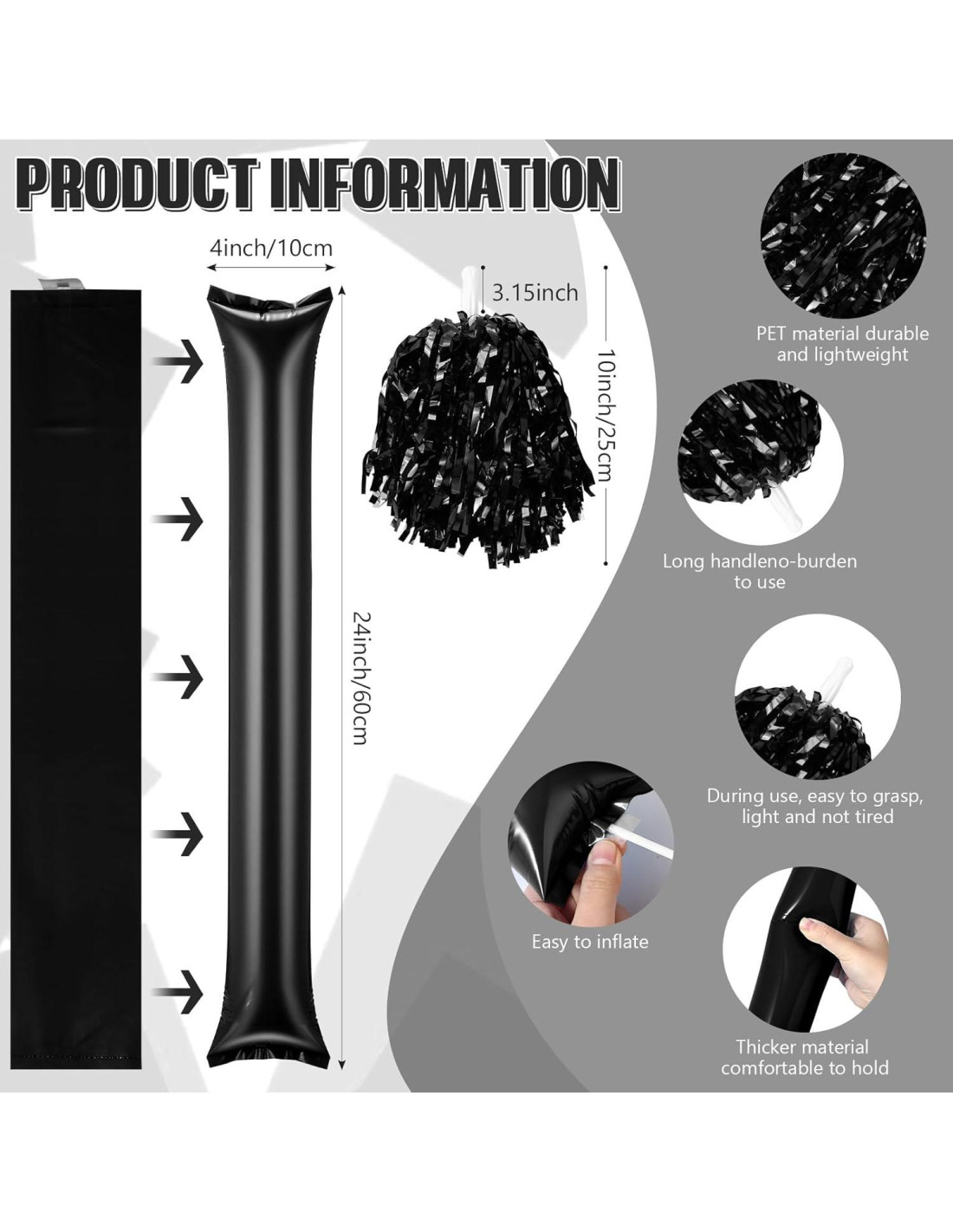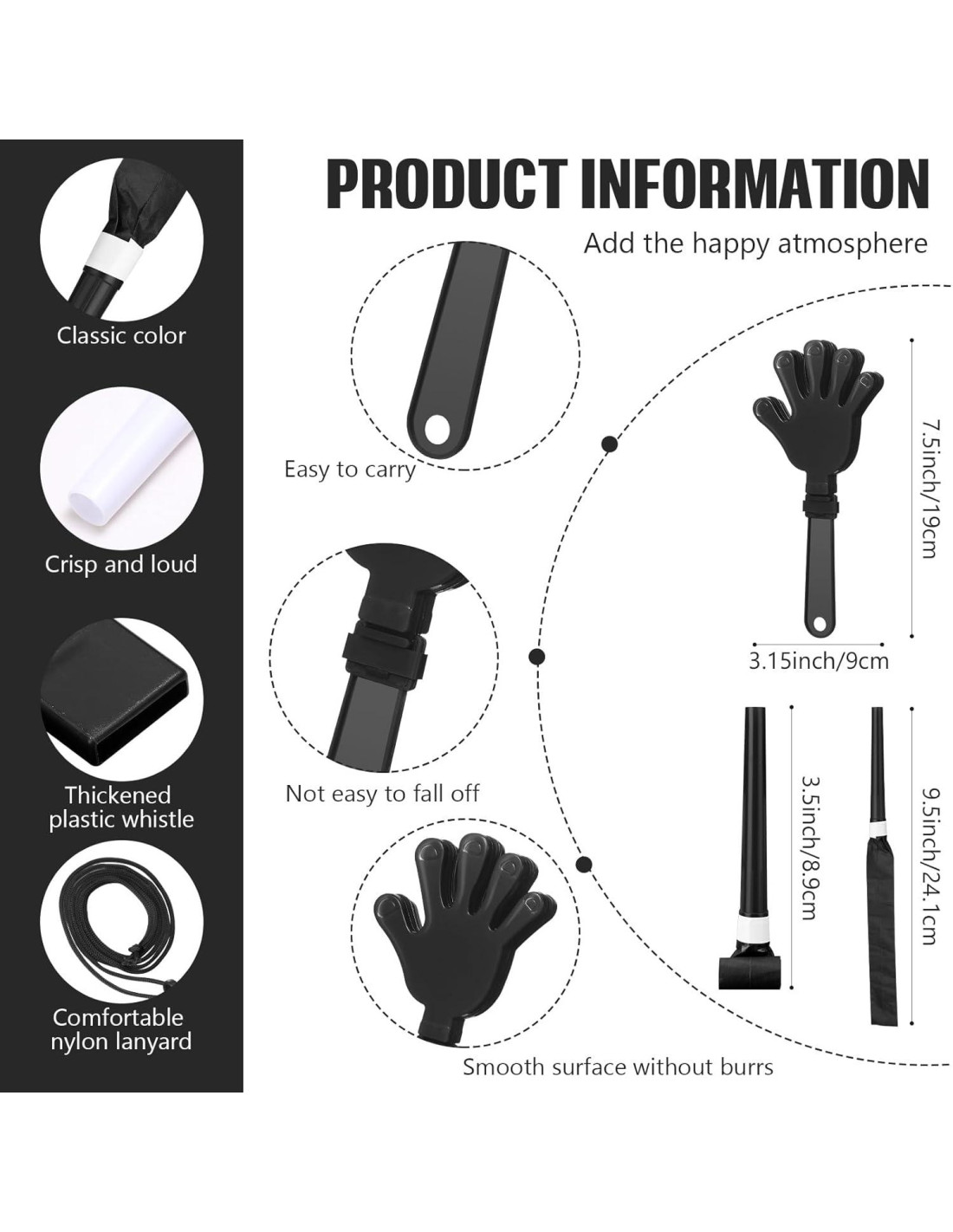 - Lo que vas a recibir: Recibirás un total de 48 accesorios de ruido, que comprenden 12 piezas de aplaudidores de mano negros, 12 pompones negros y 12 palos de trueno negros; 6 silbatos de plástico negros con cordones y 6 trompetas de mano negras; cantidad suficiente para satisfacer tus necesidades diarias de uso y reemplazo, también puedes compartirlos con tu familia