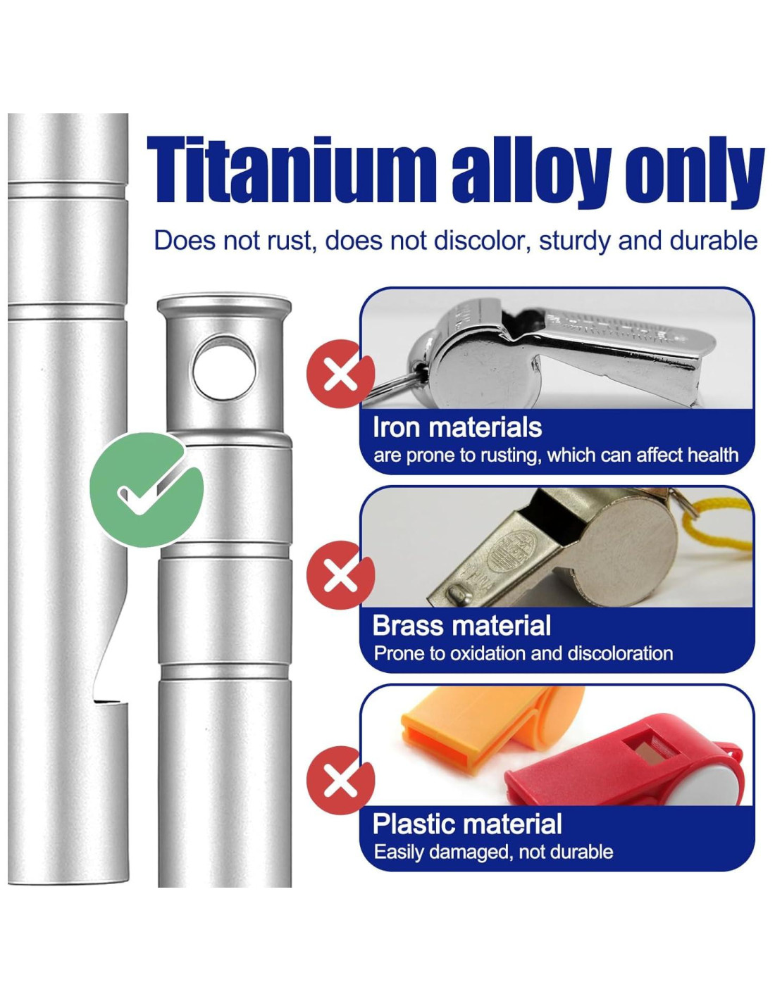 - Silbato Multifuncional: El silbato de titanio es versátil y perfecto para supervivencia, camping, senderismo, entrenamiento de mascotas, arbitraje, entrenamiento y más. Nuestros silbatos ruidosos pueden atraer la atención de otros desde una larga distancia, brindándote seguridad y protección.