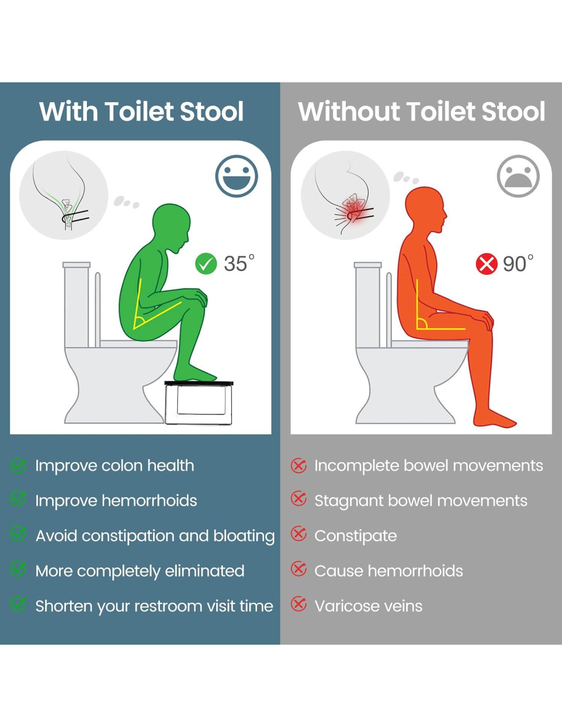 - Mejora la defecación y relaja el recto: usar un taburete de inodoro para ayudarte a imitar cuclillas naturales para alinear correctamente tu colon mejorará la salud del colon, mejorará las hemorroides, evitará el estreñimiento y la hinchazón, eliminará más completamente y acortará tus visitas al baño. Beneficios para la salud que cambian la vida, excelente para el cuidado preventivo.