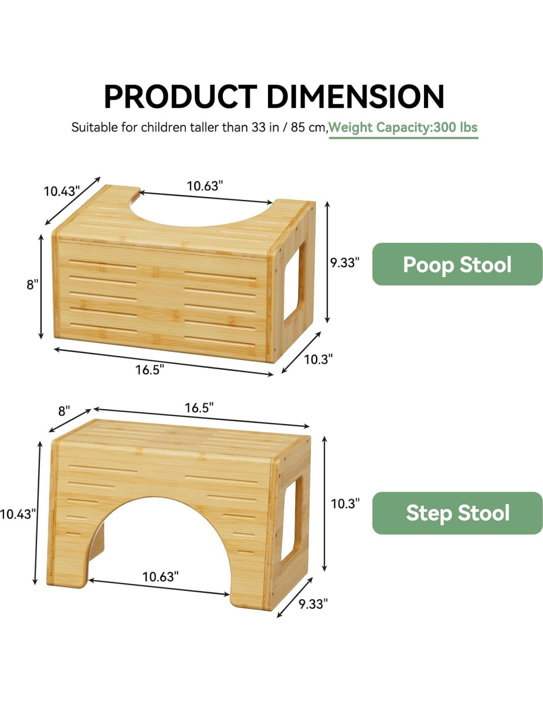 - Dimensiones: Taburete para inodoro - 16.5"W*10.3"L*9.33"H (41,91 cm x 26,16 cm x 23,66 cm), Taburete de paso - 16.5"W*8"L*10.3"H (41,91 cm x 20,32 cm x 26,16 cm). Diseñado para adaptarse a inodoros estándar y atender a niños más altos de 33 pulgadas (83,82 cm). Con un peso de solo 5.3 lbs (2,41 kg), es fácilmente movible, incluso para un niño de 3 años. Un regalo encantador y práctico para los niños.