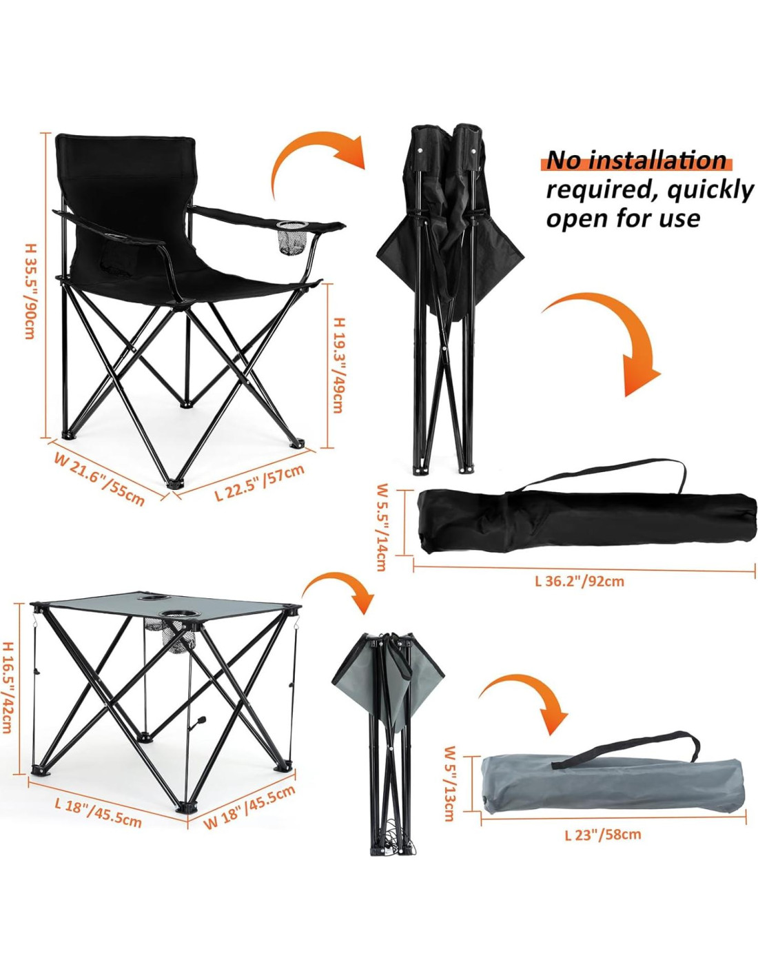 - Satisface las Necesidades de los Aficionados, recibirás 2 sillas de camping para adultos y una mesa portátil plegable, todo viene con bolsas de almacenamiento para facilitar el transporte y ahorrar espacio de almacenamiento, perfecto para BBQ, senderismo, camping, viajes en RV, vacaciones junto al lago, playa