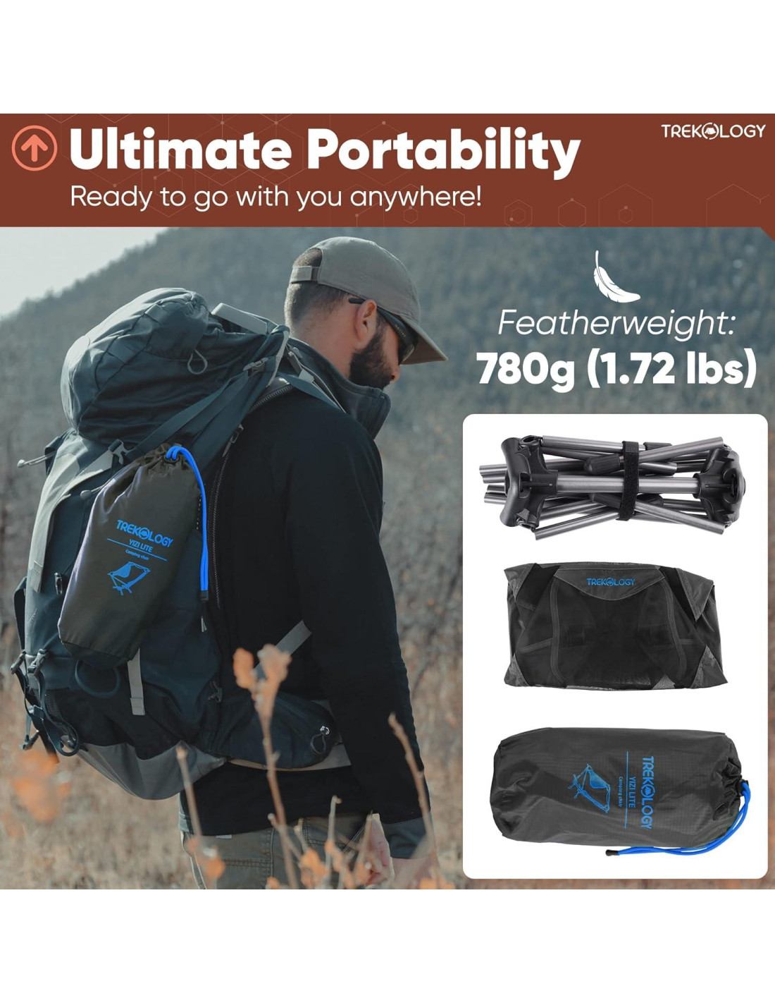 - DISEÑO ULTRALIGERO - Portabilidad definitiva con solo 780g (1.72 lbs): Esta silla de mochilero ultraligera es un imprescindible para los entusiastas del aire libre que valoran el equipo de viaje ligero. Diseñada para pesar menos que una botella de agua, asegura que puedas caminar más lejos y empacar de manera más inteligente