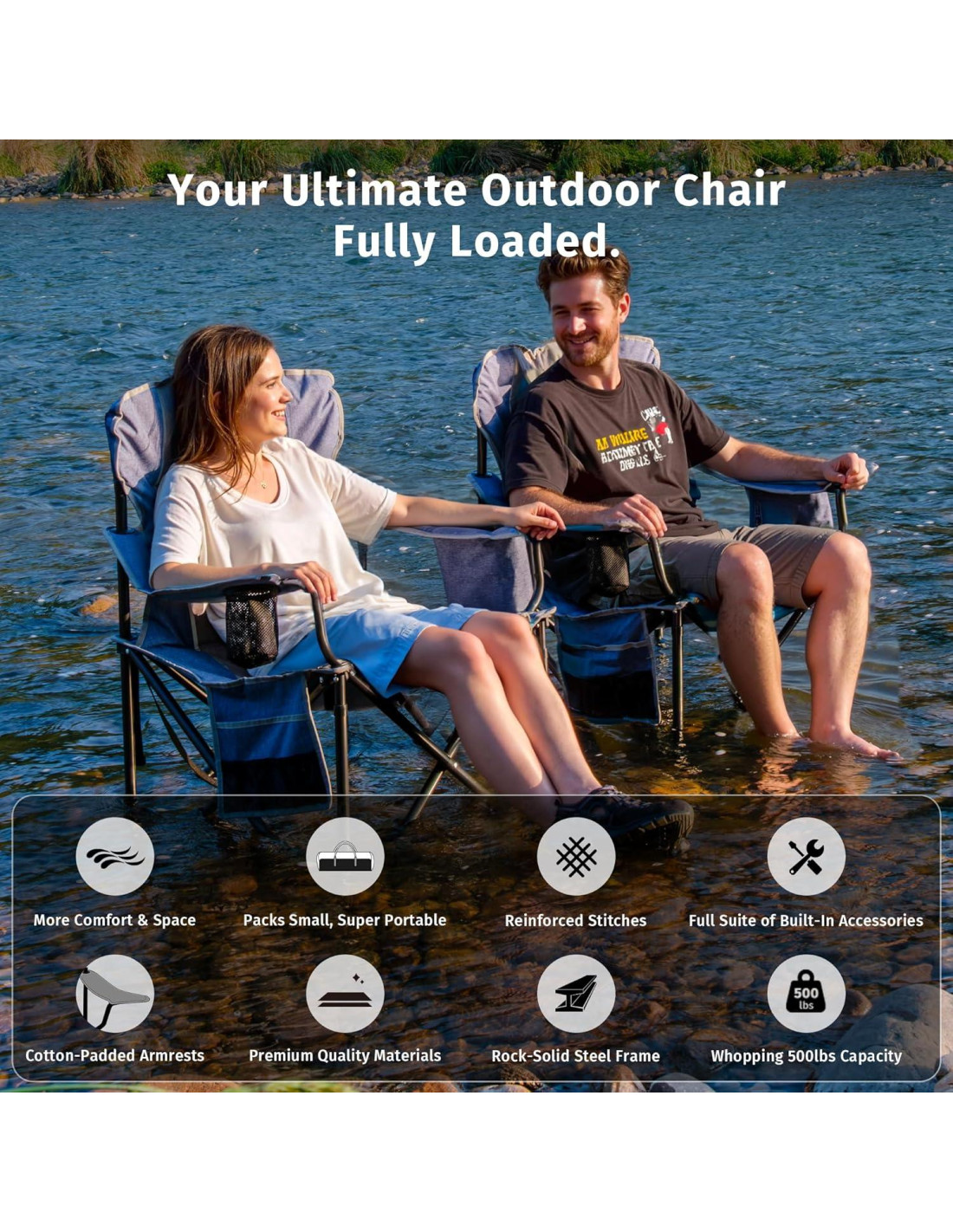 - EL MARCO SÓLIDO SOPORTA HASTA 500LBS - Construido resistente con un marco de acero reforzado que se mantiene estable en cualquier superficie, sin tambalearse, sin puntos débiles. Esta silla portátil de alta resistencia soporta hasta 500lbs (227 kg) sin flinchar, así que puedes sentarte con confianza en cualquier lugar