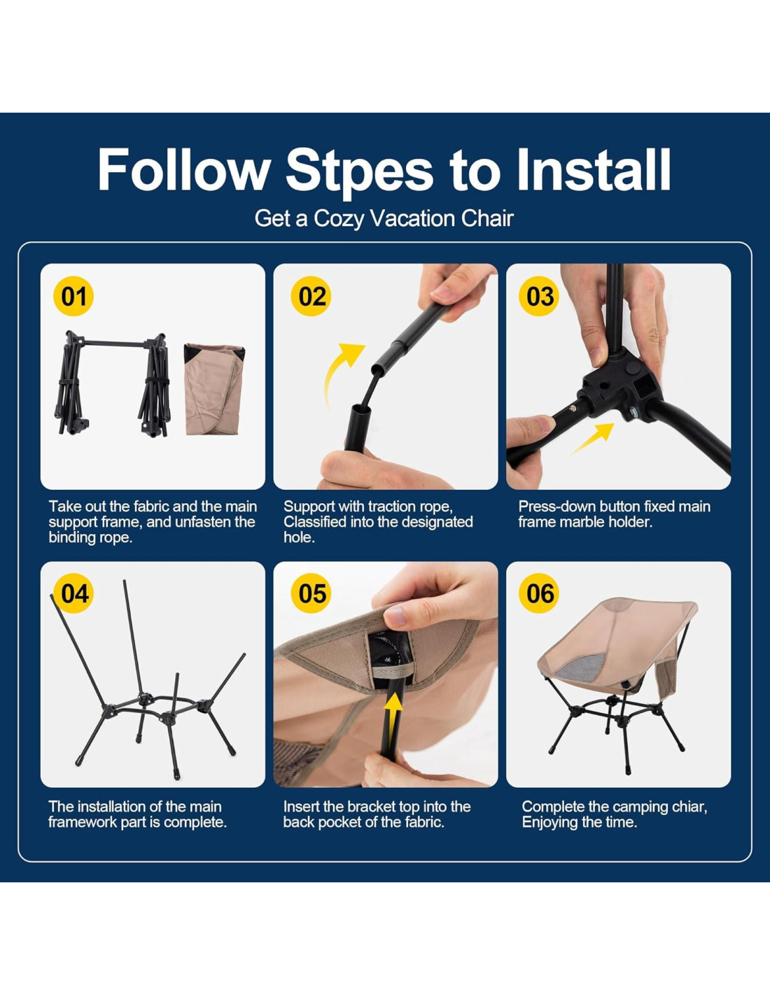 - Montaje Simple: El marco principal de la silla de senderismo está diseñado para una fácil instalación con rodamientos de bola. Simplemente alinea el marco y presiona hacia abajo para completar el ensamblaje principal. Los otros soportes de cordón elástico regresarán automáticamente cuando se alineen con los agujeros correspondientes, sin requerir experiencia previa en instalación. Finalmente, la tela se adjunta a los agujeros de soporte trasero con los soportes correspondientes para completar la instalación de la silla de camping.