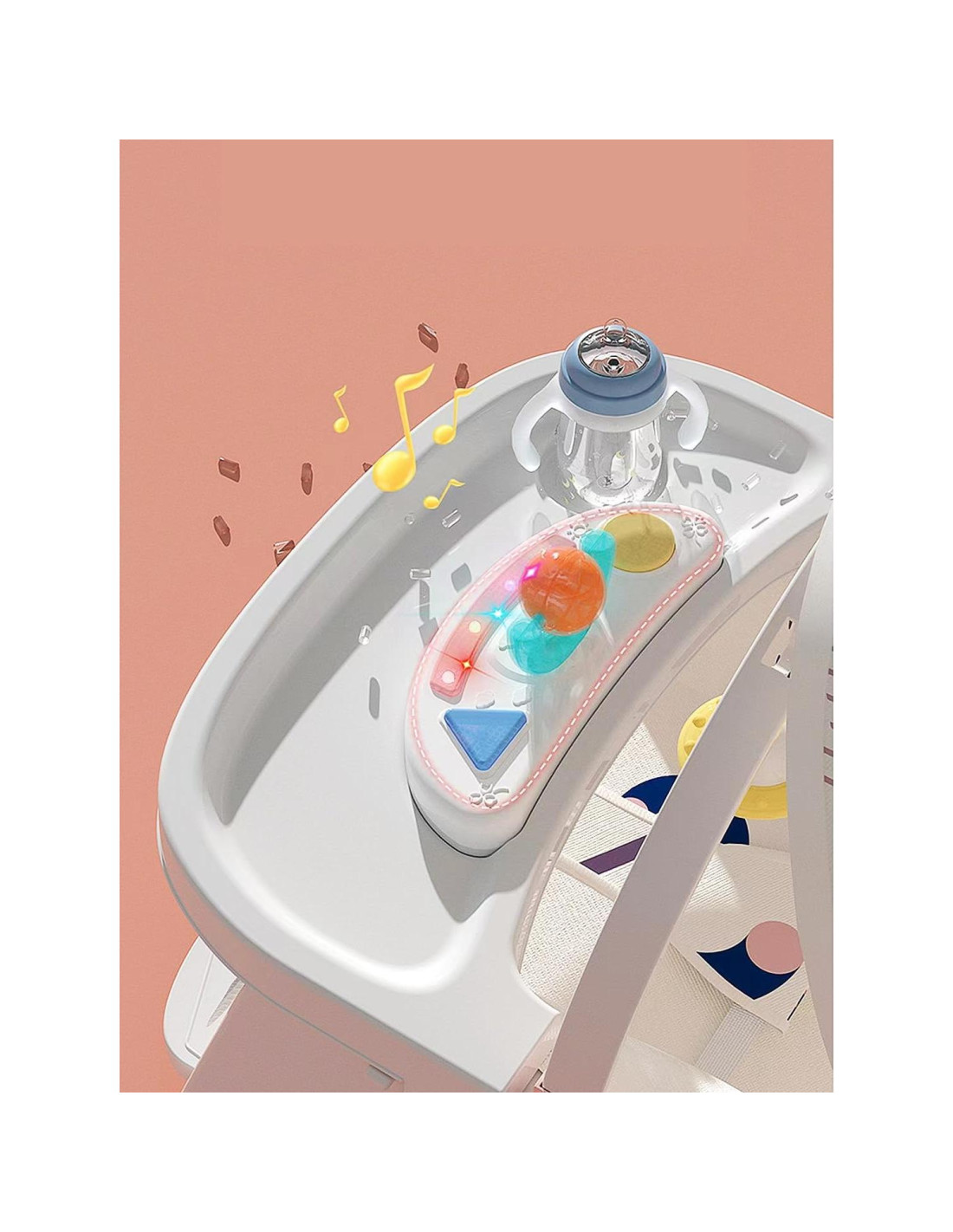 - Diseño de Plato de Cena Desmontable: La Silla de Rebotar para Bebé está equipada con un plato de cena desmontable. No contiene BPA, PVC ni ftalatos y puede ser utilizado directamente para la comida del bebé. El plato de cena no solo es fácil de limpiar, sino también seguro y ahorra espacio, lo que lo hace conveniente para el uso diario y almacenamiento.