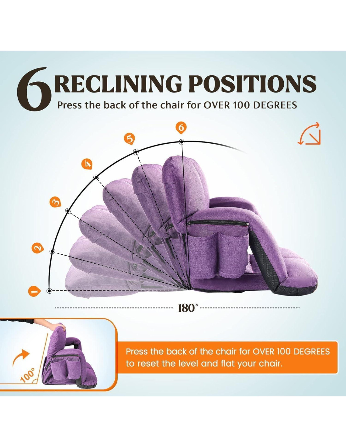 - 6 POSICIONES RECLINADAS - Encuentra tu posición cómoda sin importar la situación, esta cómoda silla de graderío puede reclinarse fácilmente en 6 posiciones diferentes. No más preocupaciones sobre que tu asiento se caiga de las gradas cuando estés animando a tu equipo deportivo o a tus hijos. NOTA: Necesitarás presionar hacia abajo en el respaldo de la silla de estadio más de 103 grados para restablecer la nivelación y aplanar la silla.