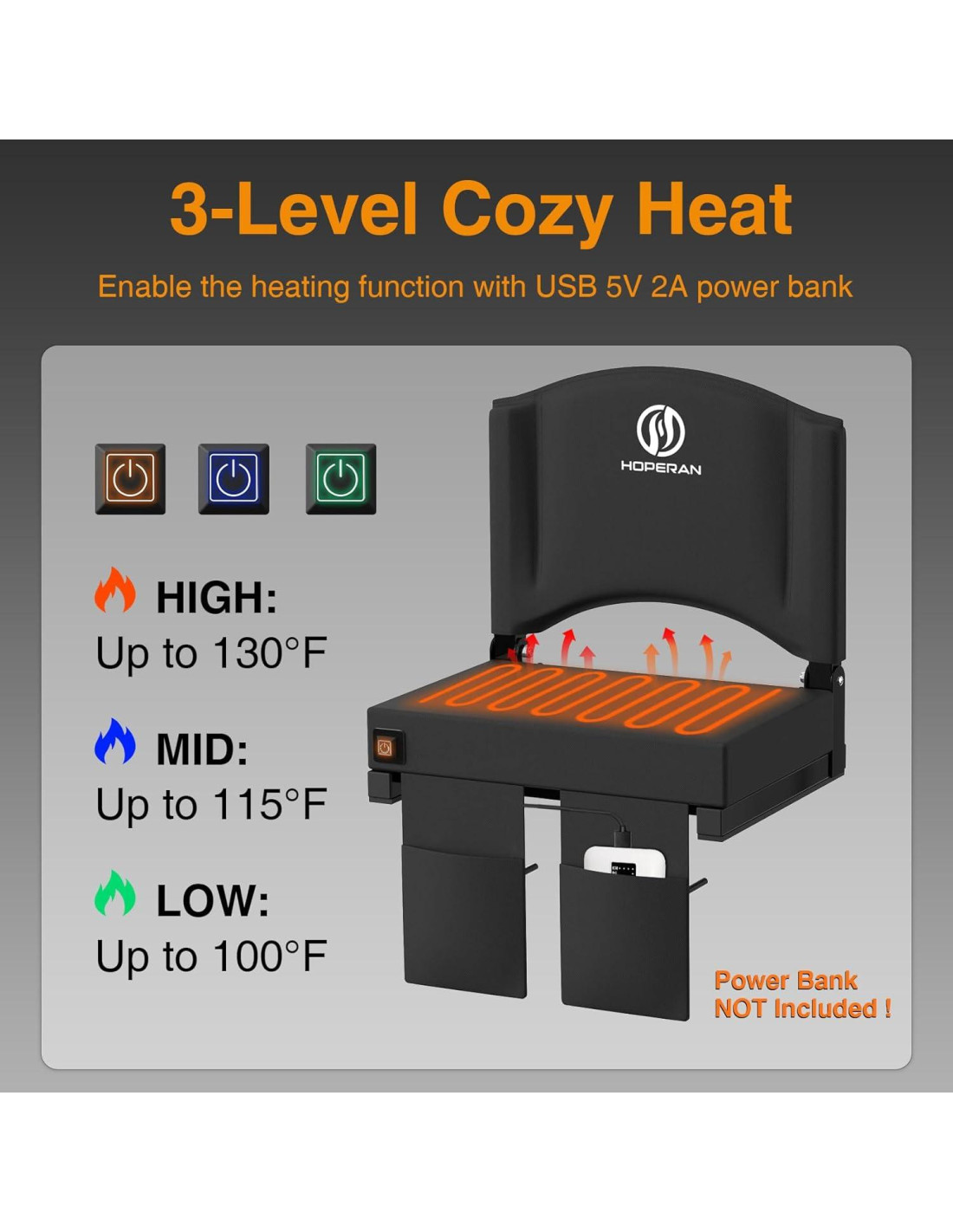 - [Cálido y Acogedor] Los asientos de estadio calentados HOPERAN para gradas con soporte para la espalda son calentados por una fuente de alimentación USB y pueden ser calentados con cualquier batería USB durante varias horas y mantenerse acogedores incluso en clima frío. 3 niveles controlan la temperatura de calentamiento: Alto, Medio y Bajo. El asiento de gradas calentado puede calentarse hasta un máximo de 54 C. Por favor NOTA: Batería externa NO incluida. Recomendamos usar una fuente de alimentación superior a 5V/2A.