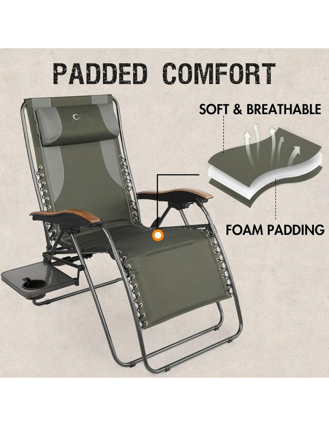 - SILLA DE DESCANSO CÓMODA Y CÓMODA: Asiento completamente acolchado, cojín ajustable para soporte de cabeza o lumbar, y reposabrazos de plástico con acabado de madera hacen que la silla de camping reclinable sea cómoda para descansar para adultos. El porta vasos puede liberar tus manos.