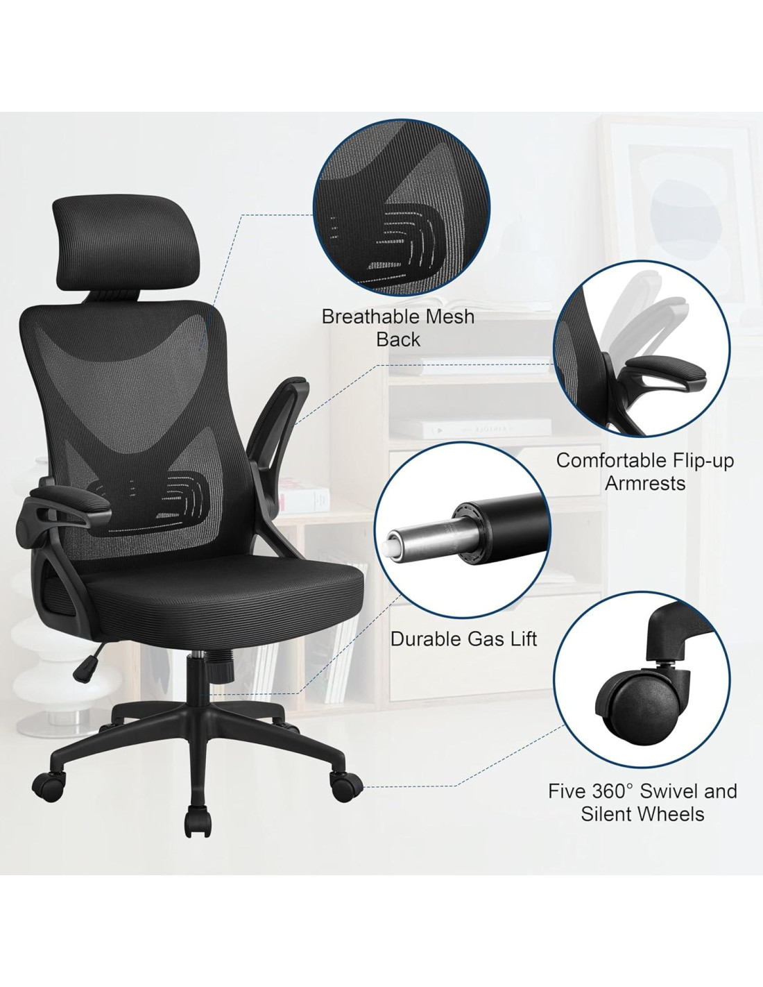 - Silla de Escritorio de Malla Ergonómica: Las características ergonómicas de esta silla de oficina de respaldo alto, que incluyen un gran reposacabezas ajustable, reposabrazos acolchados retráctiles, un cojín lumbar móvil, función de balanceo y un rango ajustable de altura del asiento de 9.4 cm, ofrecen comodidad personalizada para períodos prolongados de trabajo, estudio