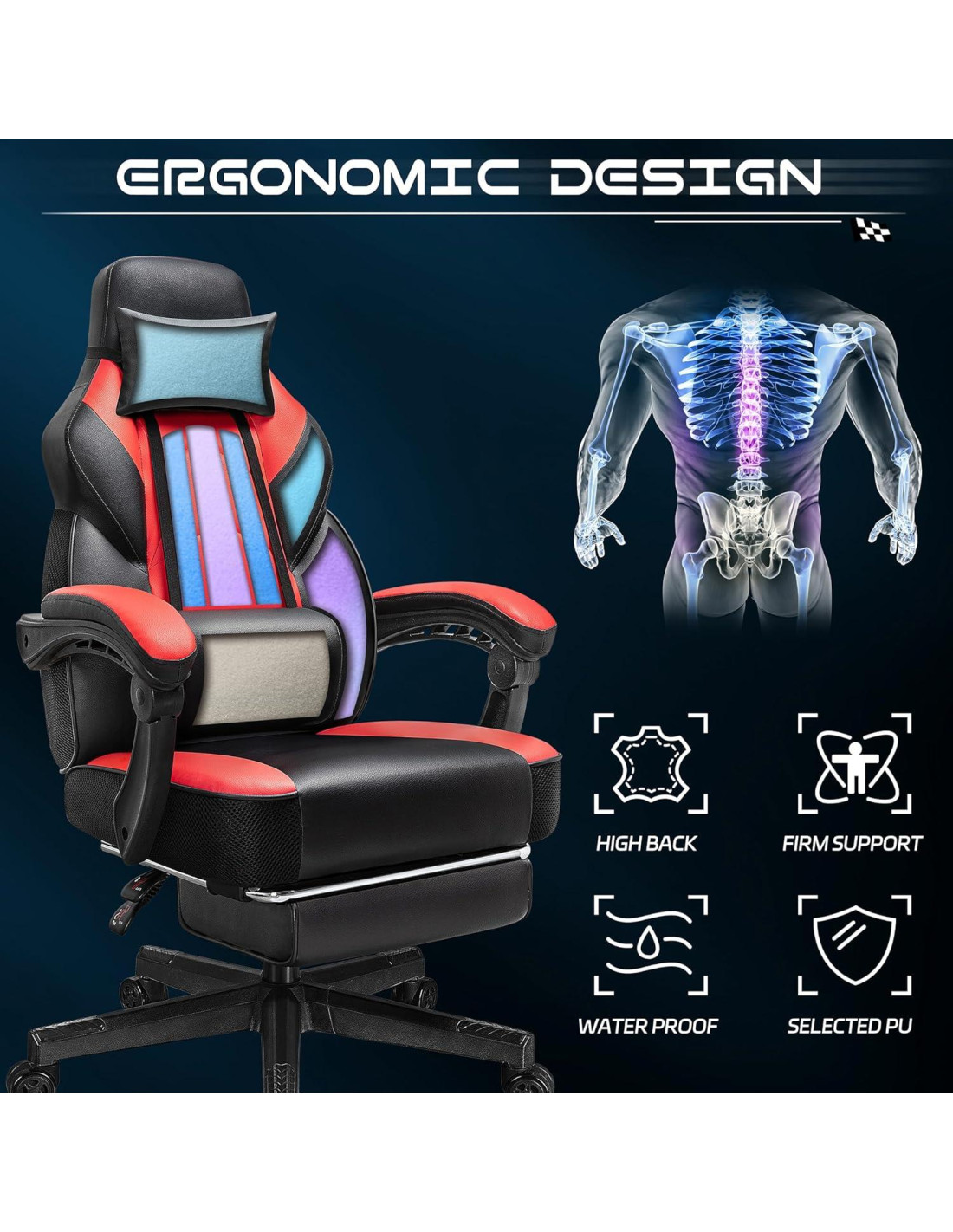 - [INFORMACIÓN DE TAMAÑO] El respaldo de la silla de juego se puede ajustar fácilmente de 90 a 160 grados para que encuentres el ángulo más adecuado. El respaldo mide 46.2cm x 87.8cm. El cojín del asiento mide 55.1cm x 48.0cm. Longitud del cojín con reposapiés extensible: 80.5cm. Altura del asiento ajustable: 45.7cm-55.9cm. La base giratoria de 360 grados proporciona un soporte robusto. Esta silla de juego se puede usar en casa o en la oficina.