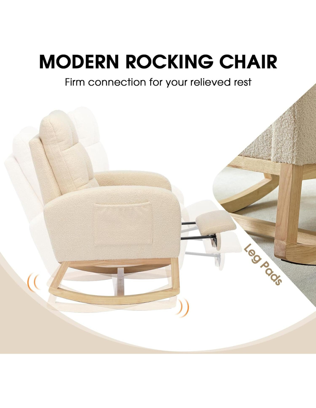- Mecedora Suave - Esta silla mecedora adopta un excelente diseño de radio que se basa en el concepto del ritmo de mecedora más cómodo del cuerpo humano y hay almohadillas antideslizantes debajo de la base, lo que hace que se meza suavemente. Un diseño tan considerado es muy adecuado para relajarse o para la guardería de bebés, aliviando efectivamente tu fatiga del día. Ofrece soporte y comodidad óptimos.