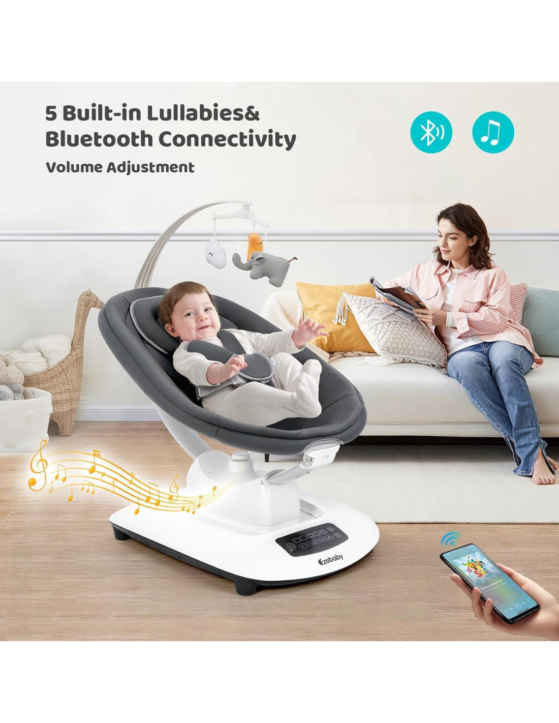 - Música Bluetooth y 5 Canciones de Cuna Integradas: Reproduce canciones de cuna calmantes o conecta tu teléfono a través de Bluetooth para mantener a tu bebé entretenido con sus melodías favoritas. El volumen ajustable asegura un ambiente pacífico.