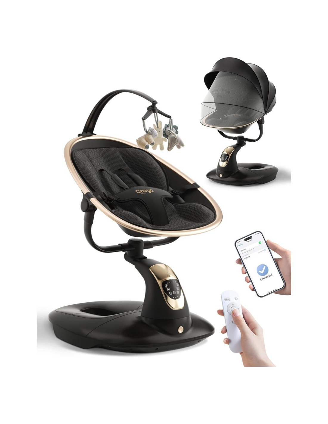- Columpio Ideal para Bebés: El columpio Oneya tiene 3 posiciones de asiento ajustables, 5 velocidades para un balanceo suave. 3 configuraciones de temporizador de apagado automático con una base grande en forma de escudo que permite a los padres tener su propio espacio y liberar sus manos. Un gran regalo para baby shower. Paquete incluido: 1 * columpio para bebé, 1 * red para mosquitos removible, 1 * control remoto, 1 * instrucciones.