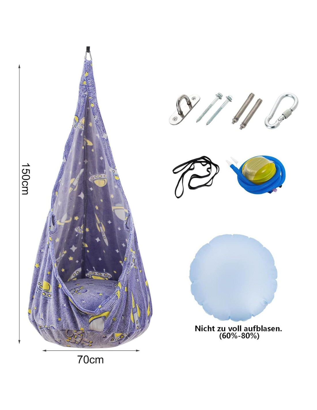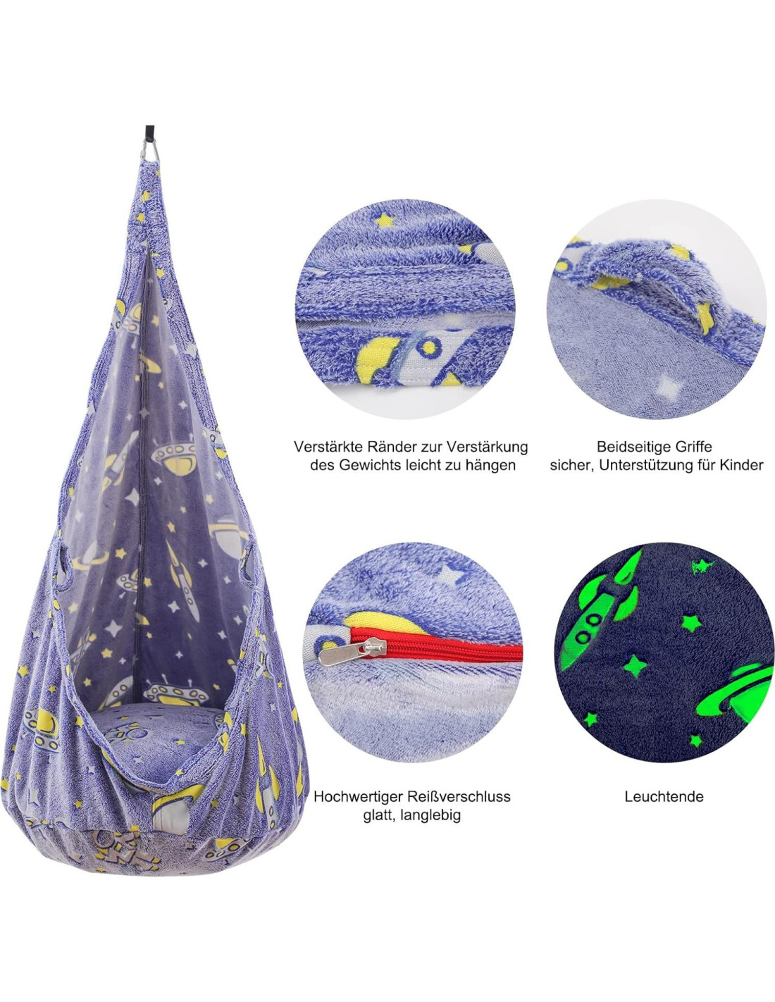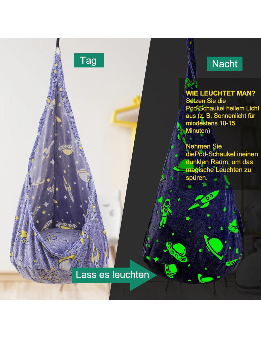 - Especificación - El tamaño de la silla hamaca para niños es dia70x150cm (dia27.5x59 pulgadas), adecuada para niños mayores de 3 años. Este poliéster de microfibra 100% premium puede brillar en la oscuridad, misterioso e interesante. Solo necesitas exponer el columpio pod a una luz brillante o luz del día por un tiempo, apagar la luz y ver la magia.