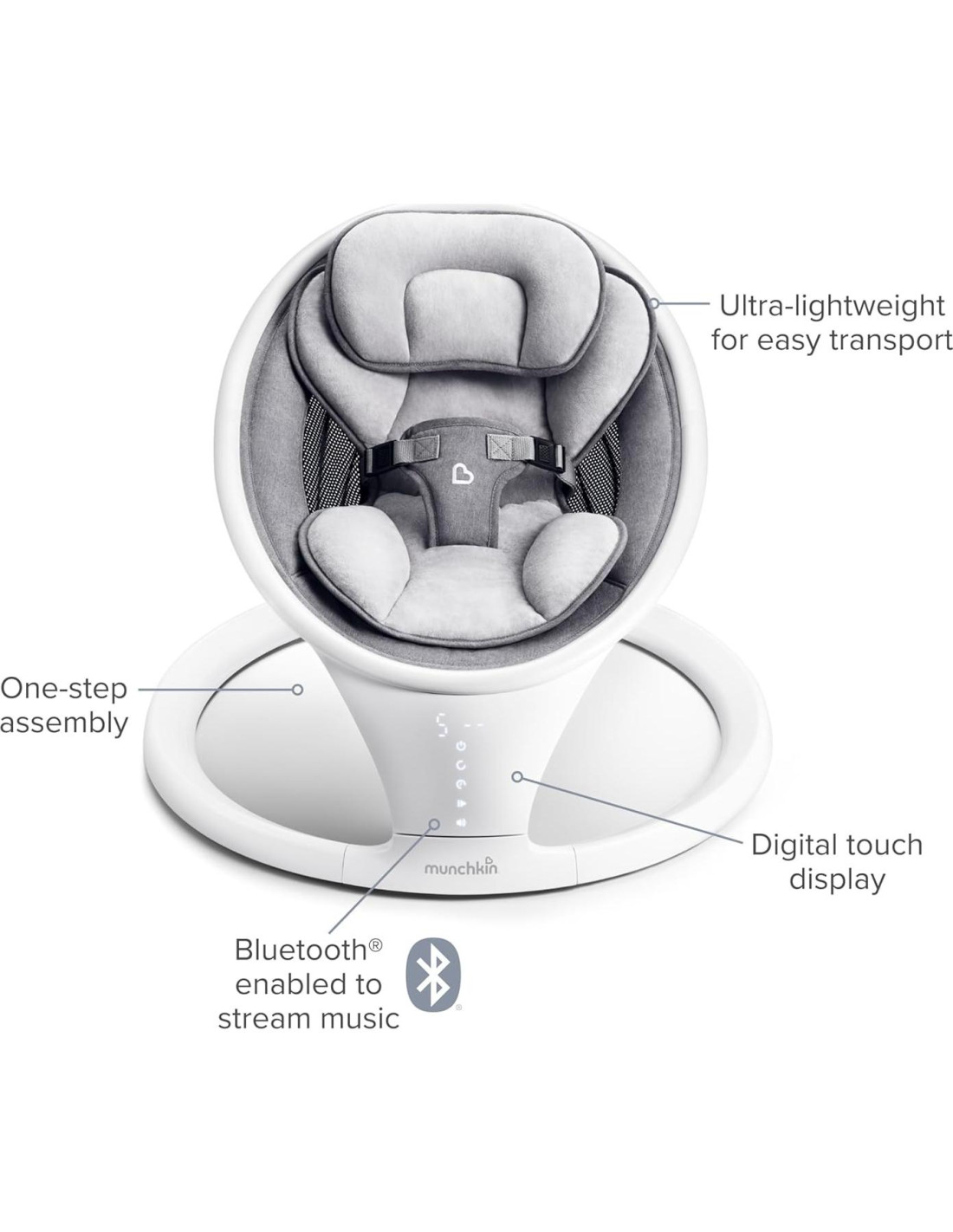 Algunos bebés solo duermen cuando son mecidos o sostenidos - lo cual es agotador para los padres privados de sueño. Cuando necesitas un segundo o tercer par de brazos para pasar el día, el columpio habilitado para Bluetooth de Munchkin está aquí para ti. Un estudio en funcionalidad elegante y diseño inteligente, este columpio para bebés tiene un perfil compacto que es fácil de armar y desarmar nuevamente. Recrea el movimiento calmante de balanceo de lado a lado que la mayoría de los bebés adoran, convirtiéndose en lo más parecido a ser acunado en tus brazos. Sosega a tu mini impresario con música clásica de Bach, Beethoven, Mozart y Chopin, o uno de los ocho sonidos ambientales. Dado que el columpio es compatible con Bluetooth, puedes conectarlo a tu teléfono y transmitir las canciones favoritas de tu bebé también. Con menos de 4.5 kilogramos, este columpio ligero para infantes se desarma convenientemente en dos partes, para que puedas guardarlo en espacios reducidos - incluso debajo de la cama. Y dado que es tan fácil de empacar, también es perfecto para transportar a casa de la abuela, de vacaciones, o simplemente de habitación en habitación en casa. Es hora de recuperar tus brazos - y tu cordura. Incluye una garantía limitada de 1 año.